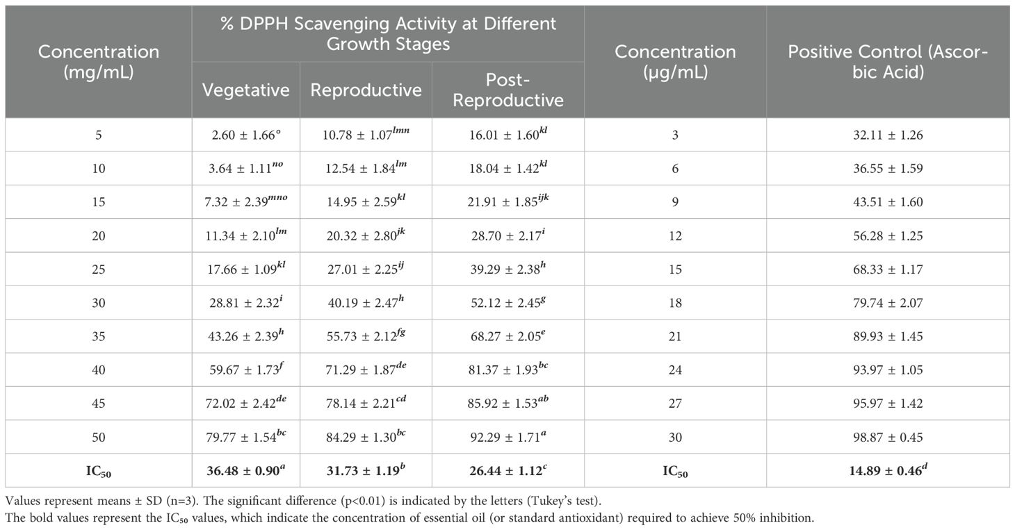 OriginPro software was utilized for statistical analysis. Descriptive statistics, including the calculation of means (n=3) and standard deviations (SD), were reported as mean ± SD for each treatment group. To evaluate statistical significance among groups, both one-way and two-way ANOVA were applied. One-way ANOVA was used to compare the means among the different essential oil treatments, while two-way ANOVA examined interaction effects between growth stages and variations in bioactivity. Following ANOVA, the Tukey test was performed to pinpoint significant differences between group means. Principal Component Analysis (PCA) was conducted to demonstrate how various growth stages of the plant influenced the bioactivity of the essential oils. All experimental procedures were conducted in triplicate to enhance reliability and reproducibility. The normal distribution of the data was checked before analysis, and statistical significance was defined at a p-value of less than 0.05 for all tests. IC50 values were determined using non-linear regression analysis with a sigmoidal dose-response model.