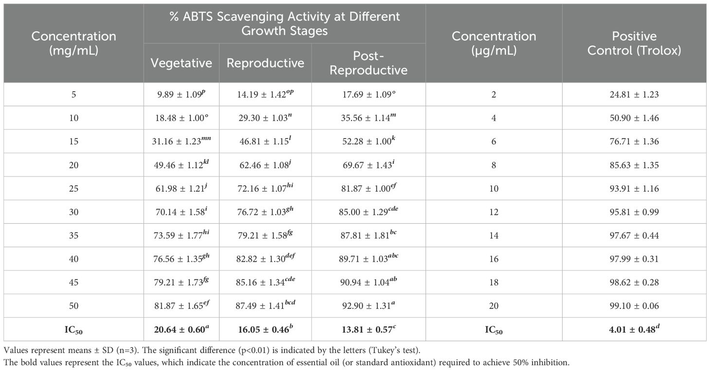 Table 5. ABTS radical scavenging activity and IC50 of essential oils of Cymbopogon martinii at different growth stages and the standard.
