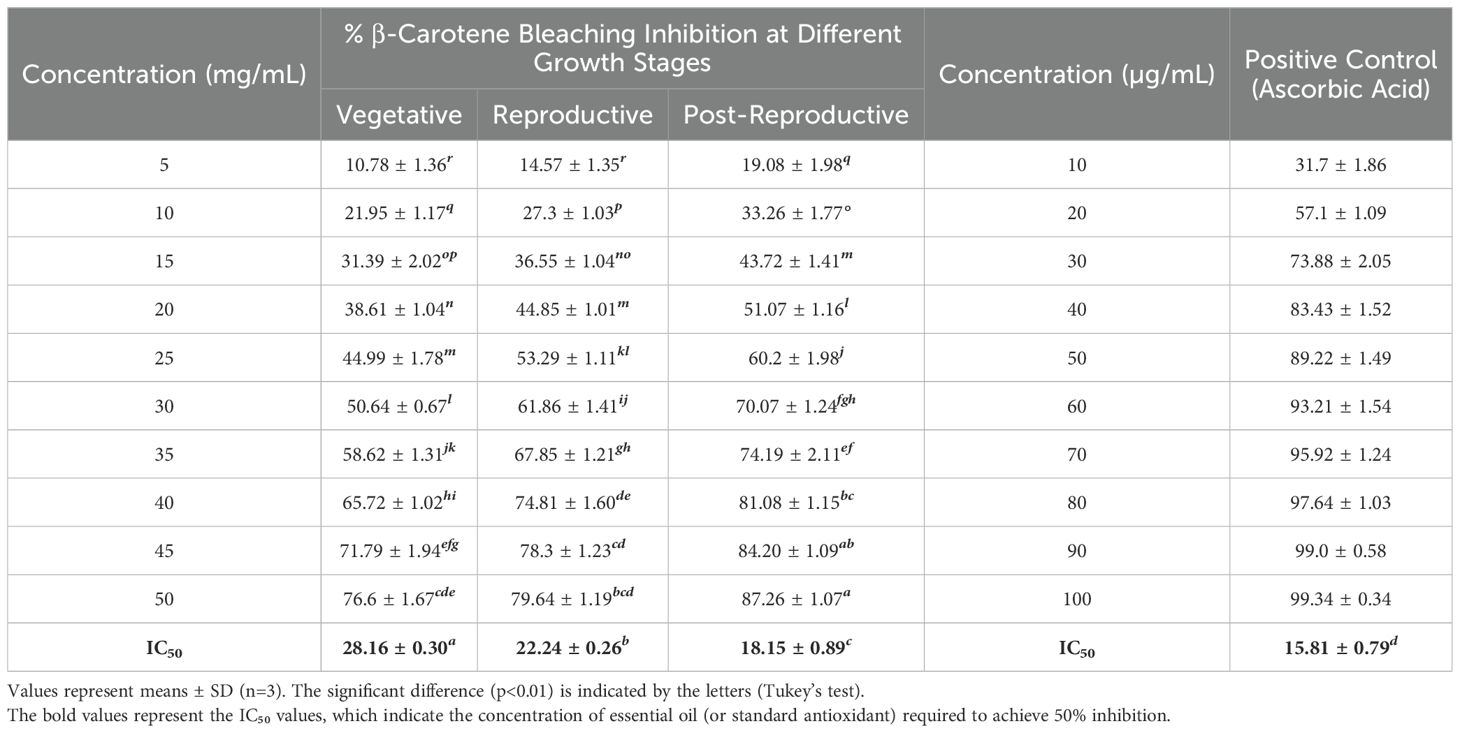 The antioxidant activity of CMEOs from vegetative, reproductive, and post-reproductive stages was evaluated using DPPH, ABTS, and β-carotene bleaching assays, with significant variation observed across stages (P < 0.0001) (Figures 46). In the DPPH assay (Figure 4), post-reproductive EO exhibited the highest scavenging activity (92.29% at 50 mg/mL), followed by reproductive (84.29%) and vegetative (79.77%) stages. IC50 values followed the same trend: post-reproductive (26.44 mg/mL), reproductive (31.73 mg/mL), and vegetative (36.48 mg/mL). Ascorbic acid (standard) achieved 98.87% inhibition at 30 µg/mL with an IC50 of 14.89 µg/mL (Table 4). The ABTS assay (Figure 5) also showed stage-dependent activity. Post-reproductive EO demonstrated the strongest inhibition (92.90% at 50 mg/mL, IC50= 13.81 mg/mL), followed by reproductive (87.49%, IC50 = 16.05 mg/mL) and vegetative (81.87%, IC50 = 20.64 mg/mL). Trolox (standard) reached 92.90% inhibition at 20 µg/mL with an IC50 of 4.01 µg/mL (Table 5). In the β-carotene bleaching assay (Figure 6), inhibition ranged from 76.6% to 87.26%. The post-reproductive EO showed the highest activity (87.26%), followed by reproductive (79.64%) and vegetative (76.6%) stages. IC50 values were lowest in the post-reproductive EO (18.15 mg/mL), followed by reproductive (22.24 mg/mL) and vegetative (28.16 mg/mL) (Table 6). Ascorbic acid again showed strong activity (IC50 = 15.81 µg/mL). Kinetic monitoring of β-carotene degradation (Figure 6c) confirmed sustained inhibition over time, strongest in post-reproductive EO, followed by reproductive and vegetative stages. Overall, the antioxidant potential of CMEO increased progressively from vegetative to post-reproductive stages across all assays. Correlation analysis (Supplementary Figure S4) revealed strong negative correlations between IC50 values and compounds such as α-methylcinnamaldehyde, (S)-perillyl alcohol, and eugenol, indicating their key contribution to antioxidant activity.