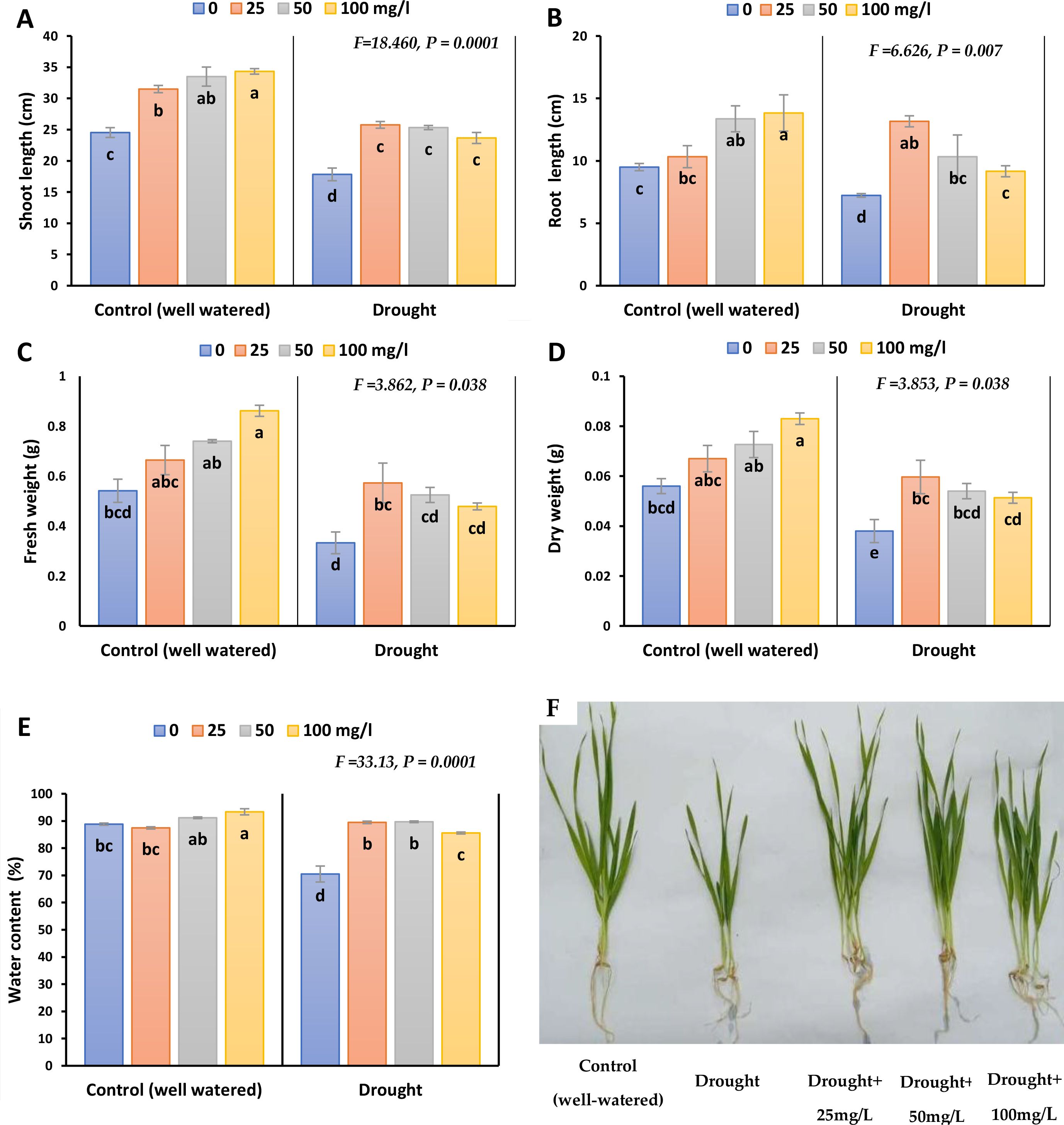 Figure 2. Growth parameters of barley plants treated with 25, 50 and 100 mg/L CaPNPs under control (well-watered) or (FC 30%) in 2023. (A) Shoot length, (B) Root length, (C) Fresh weight, (D) Dry weight, (E) Water content, (F) Representative image of barley plants under control and drought conditions with various CaPNP treatments. Values represent mean ± SD (n=3). Different letters indicate significant differences at p < 0.05 (Tukey’s).