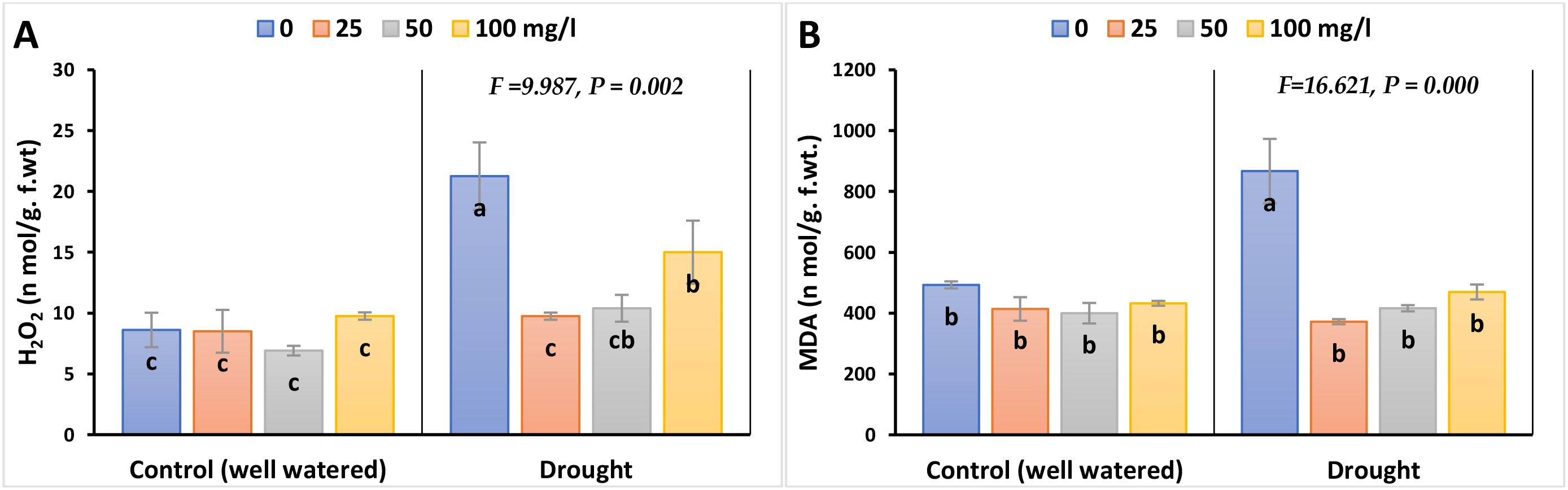 Figure 3. Effects of calcium phosphate nanoparticles (CaPNPs) on stress biomarkers in barley plants under well-watered (control) and drought stress (FC 30%) conditions in 2023. The figure presents the effects of various concentrations of CaPNPs (25, 50, and 100 mg/L) on two key stress indicators: (A) H2O2 (Hydrogen Peroxide) and (B) MDA (Malondialdehyde): The product of lipid peroxidation. Values represent mean ± SD (n=3). Different letters indicate significant differences at p < 0.05 (Tukey’s).
