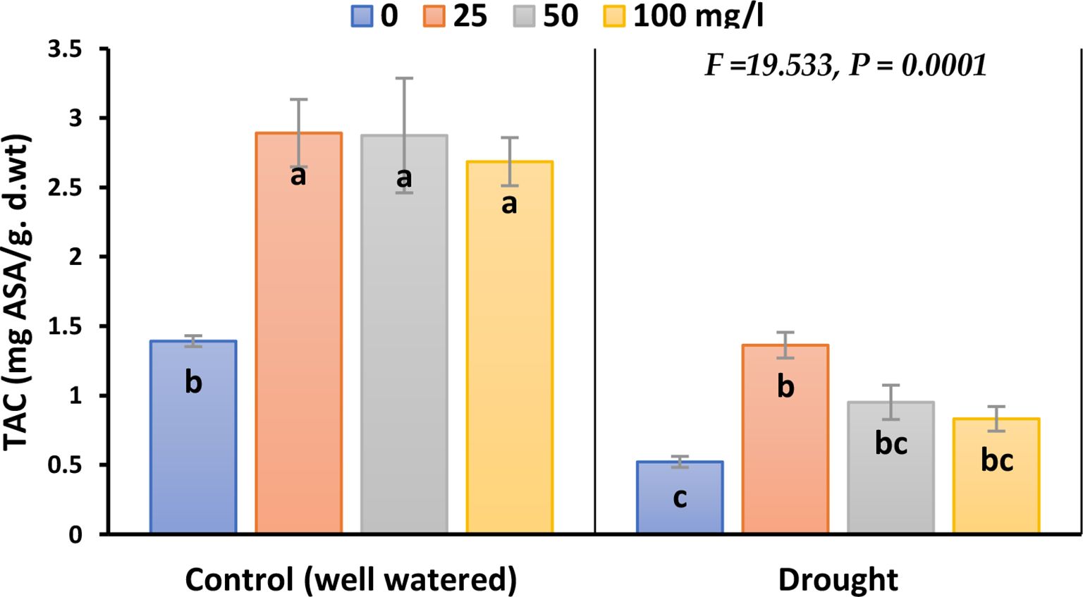 Figure 4. Total antioxidant capacity (TAC) of barley plants treated with 25, 50 and 100 mg/L CaPNPs under control (well-watered) or (FC 30%) in 2023. Values represent mean ± SD (n=3). Different letters indicate significant differences at p < 0.05 (Tukey’s).