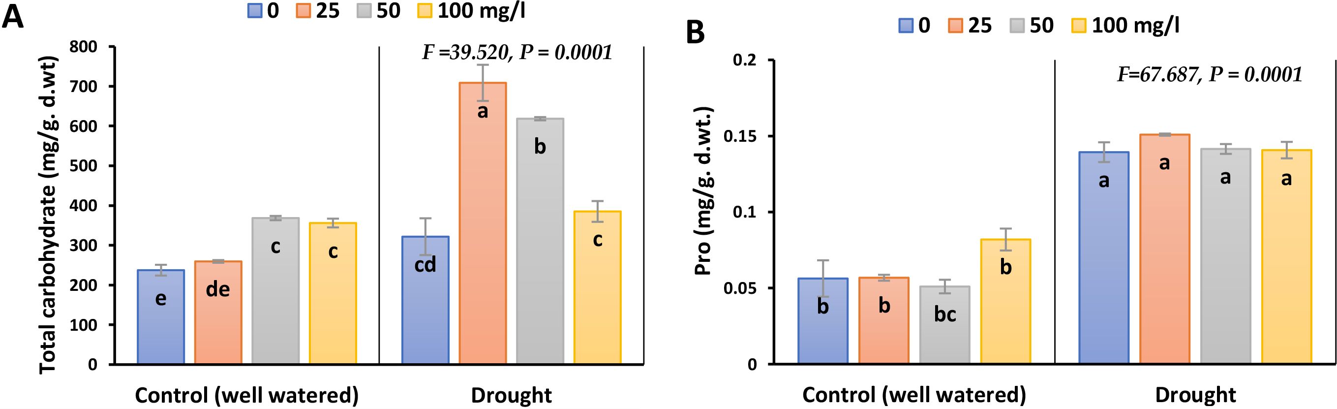 Figure 5. Osmolytes accumulation in barley plants treated with 25, 50 and 100 mg/L CaPNPs under control (well-watered) or (FC 30%) in 2023. (A) Total carbohydrate and (B) Proline. Values represent mean ± SD (n=3). Different letters indicate significant differences at p < 0.05 (Tukey’s).