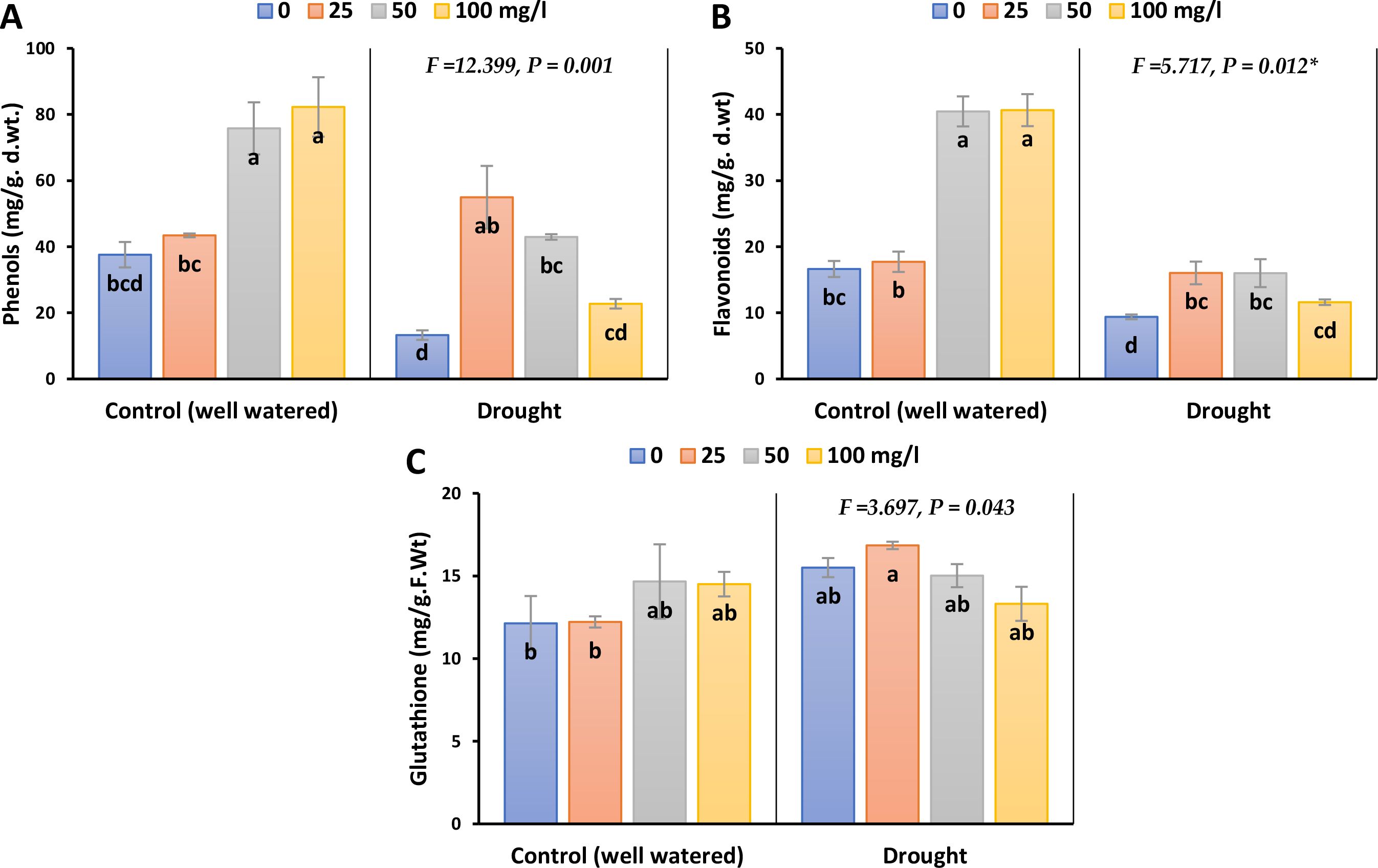 Figure 6. Non-enzymatic antioxidants of barley plants treated with 25, 50 and 100 mg/L CaPNPs under control (well-watered) or (FC 30%) in 2023. (A) Total phenolic contents. (B) Total Flavonoids, (C) Reduced Glutathione. Values represent mean ± SD (n=3). Different letters indicate significant differences at p < 0.05 (Tukey’s).