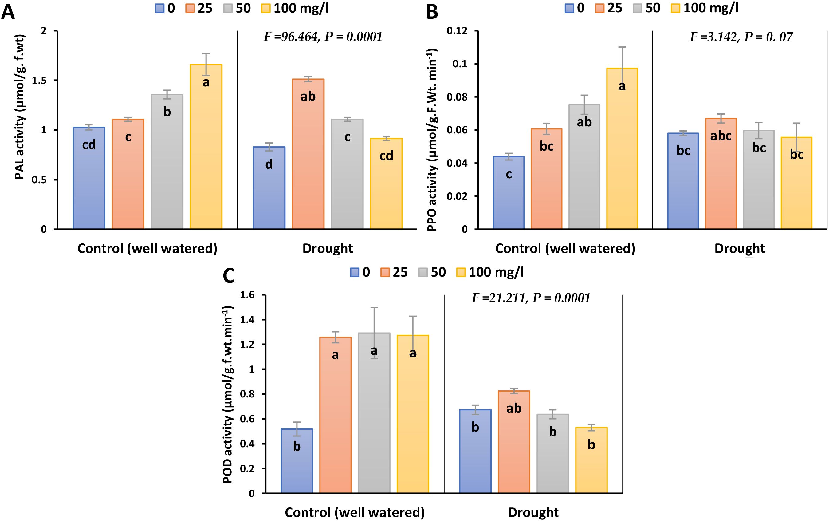 Figure 7. Activities of antioxidant enzymes of barley plants treated with 25, 50 and 100 mg/L CaPNPs under control (well-watered) or (FC 30%) in 2023. (A) Phenyl alanine activity, (B) PPO (C) POD activity. Values represent mean ± SD (n=3). Different letters indicate significant differences at p < 0.05 (Tukey’s).