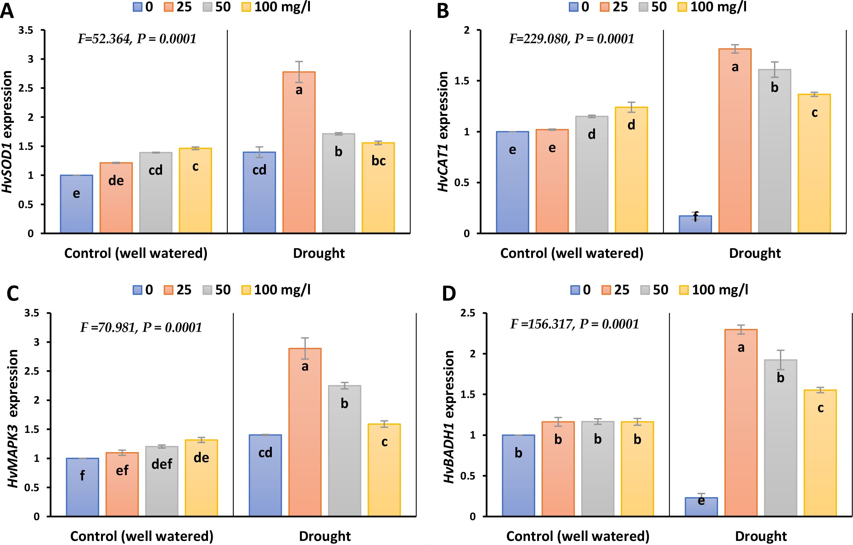 Figure 8. Gene expression (A. HvSOD1 (Superoxide Dismutase), (B) HvCAT1 (Catalase), (C) HvMAPK3 (Mitogen Activated Protein Kinase) and (D) HvBADH1 (Betaine Aldehyde Dehydrogenase) of barley plants treated with 25, 50 and 100 mg/L CaPNPs under control (well-watered) or (FC 30%) in 2023. Values represent mean ± SD (n=3). Different letters indicate significant differences at p < 0.05 (Tukey’s).