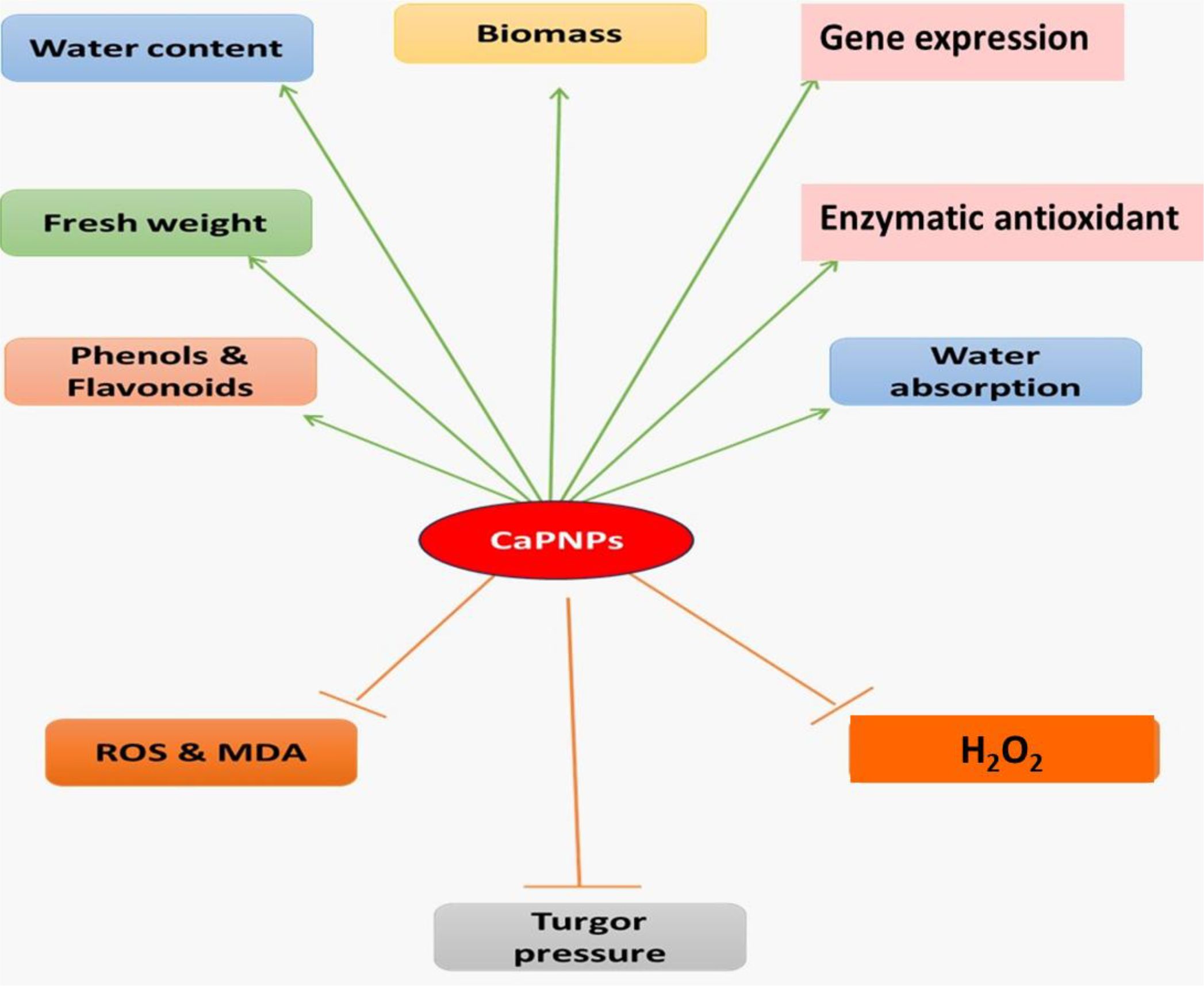 Figure 9 highlights the potential of CaPNPs to alleviate drought stress in barely in terms of growth characteristics, antioxidative modulation, in addition to molecular approaches.