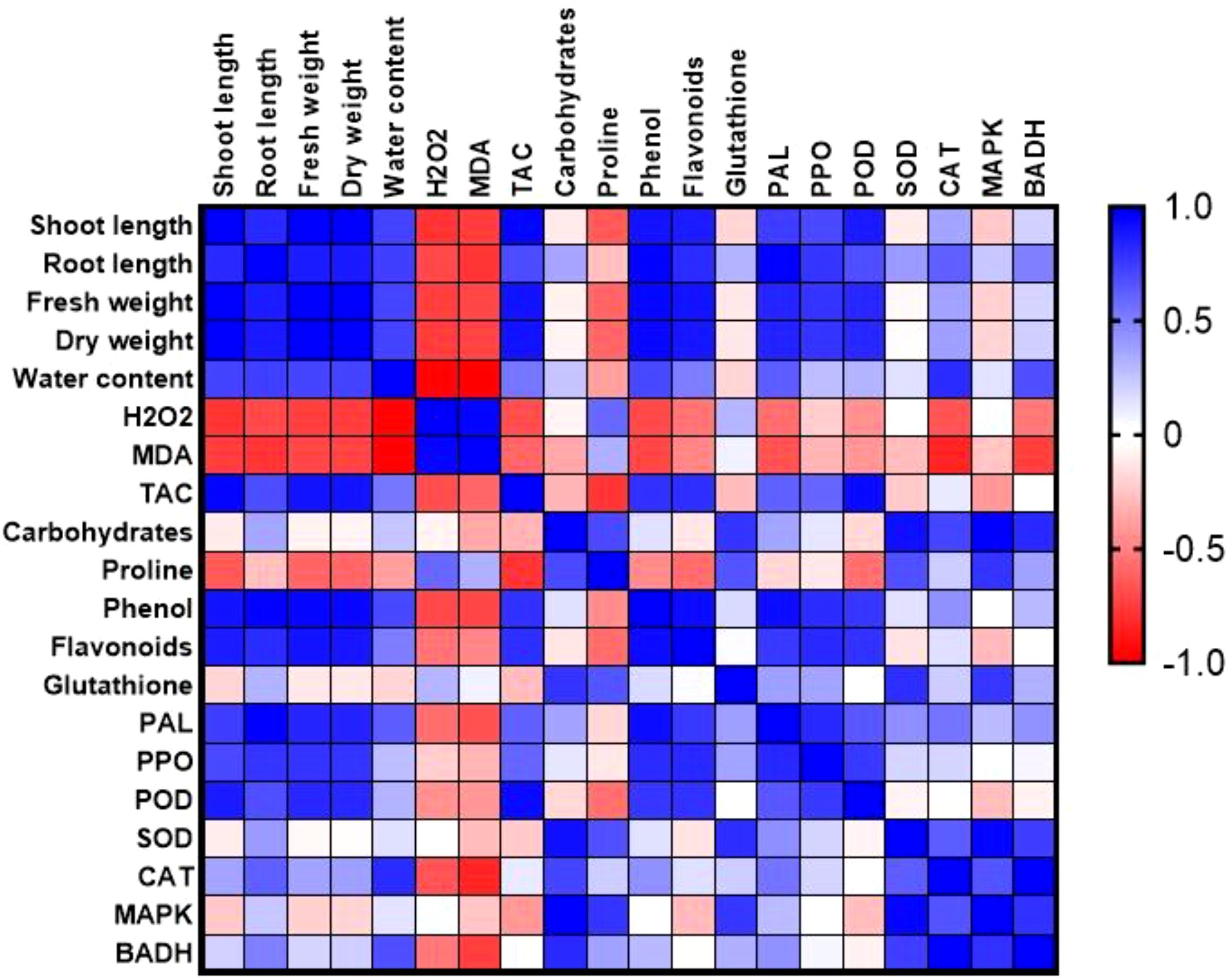 Pearson’s simple correlation provided a comprehensive visualization of the interrelationships among physiological, biochemical traits and molecular approaches in drought-stressed plants and treated with various concentrations of biogenic CaPNPs (Figure 10). Strong positive correlations (r > 0.9) were observed among growth parameters (shoot and root length, fresh and dry weight) and WC, indicating that improved hydration status directly supported biomass accumulation. These growth-related traits were also positively correlated (r > 0.85) with phenolic and flavonoid contents, as well as TAC, suggesting that enhanced secondary metabolism and antioxidant potential contributed to maintaining growth under stress. Growth parameters and WC were further associated with elevated activities of enzymatic antioxidants (PAL, PPO, POD, SOD, and CAT), reflecting a coordinated defense strategy in which increased antioxidant enzyme activities mitigate oxidative stress, thereby sustaining plant performance. In addition, expression levels of HvMAPK3 and HvBADH1 showed strong positive correlations (r > 0.8) with antioxidant enzymes, carbohydrates, Pro, and GSH, highlighting the regulatory role of these stress-responsive genes in modulating osmolyte accumulation and redox homeostasis. Conversely, oxidative stress markers (H2O2 and MDA) exhibited strong negative correlations (r < -0.85) with growth traits and antioxidants, confirming that higher oxidative damage impaired plant development and reduced metabolic efficiency. Interestingly, H2O2 and MDA showed positive correlations with Pro accumulation, which may reflect a compensatory response, where osmolyte build-up is triggered under conditions of oxidative stress to protect cellular functions.