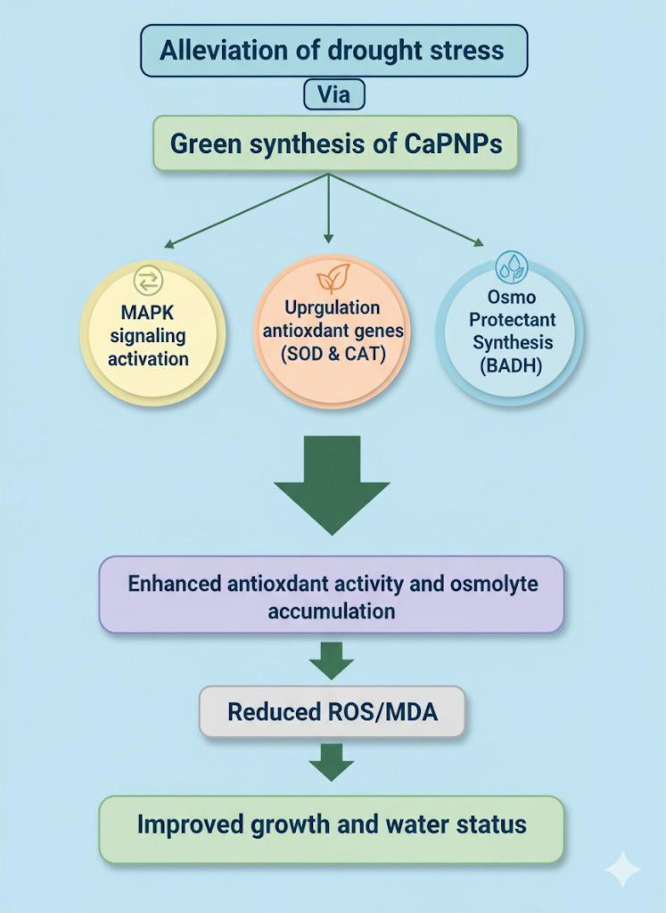 Taken together, after interpreting all the results and linking them, it can be said that CaPNPs were able to resist drought through regulating the buildup of osmoprotectants, enhancing antioxidant activity and influencing the expression of genes involved in drought response. The data strongly suggests that the lower dose (25 mg/L) is more beneficial under drought stress, while higher doses may be better for well-watered conditions. Such dose-dependent plant responses are linked to physiological state under drought versus control conditions. The focus on the 25 mg/L dose of CaPNPs is justified by its optimal effect under drought stress, as this low dose is sufficient to prime defense responses such as antioxidant enzyme activation and osmolyte accumulation without imposing metabolic burden or toxicity that higher doses might cause under stress. This dose likely hits a signaling threshold that efficiently triggers protective mechanisms like enhanced water retention and photosynthetic activity, mediated by key phytohormones such as abscisic acid as suggested by Li et al. (2017). Under well-watered control conditions, higher doses (50 and 100 mg/L) can support greater biomass accumulation and metabolic activity, because resource availability and stress signaling thresholds differ, making those doses more beneficial when stress is absent. Thus, the dose-dependent effect reflects the balance between inducing stress tolerance pathways without overwhelming cellular metabolism in drought, versus maximizing growth potential under optimal conditions. This nuanced interpretation enriches the discussion by linking nanoparticle dose, plant physiological state, and stress signaling dynamics in a sophisticated manner.