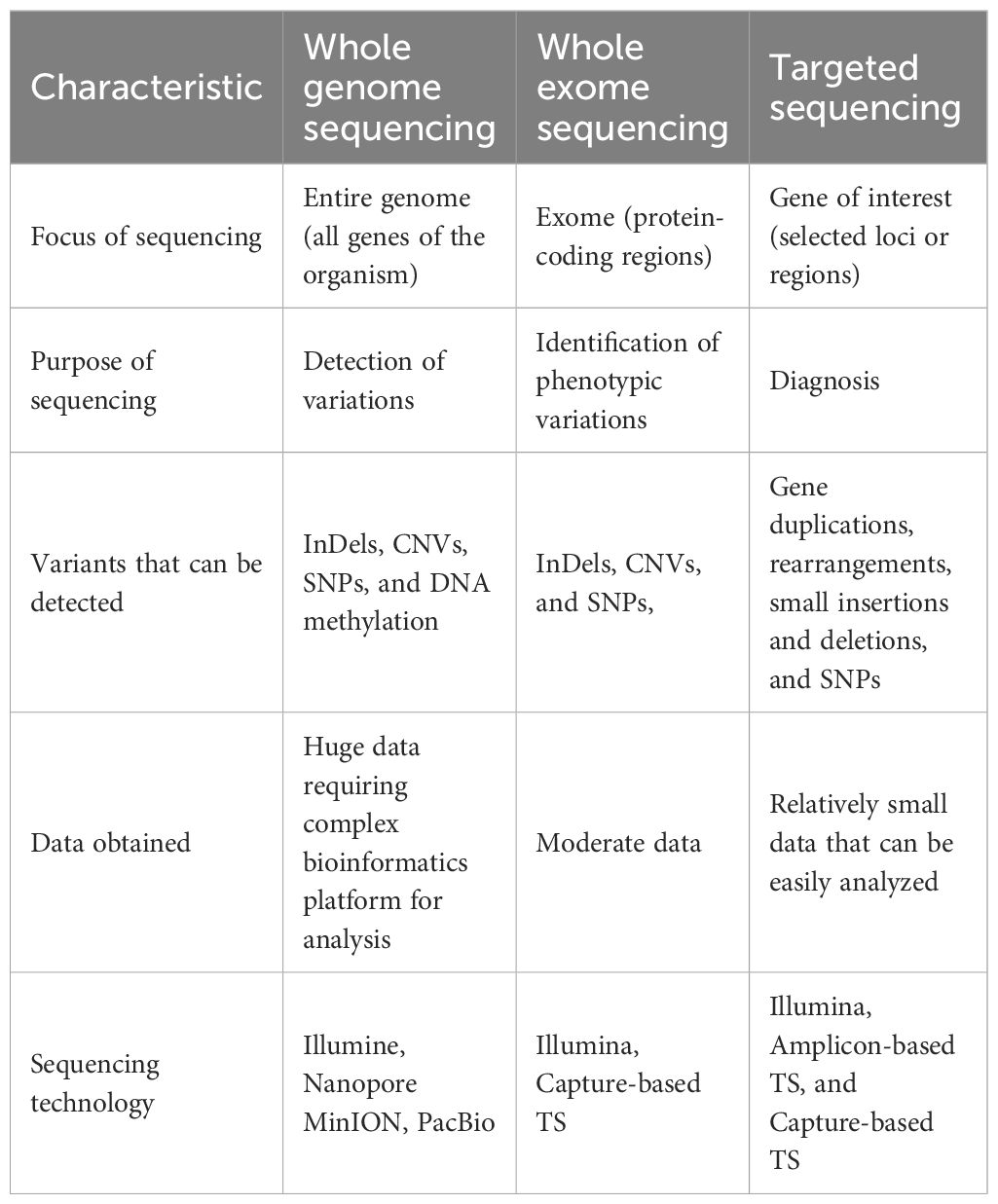 A genome is the complete set of all the genetic material in an organism. It contains the DNA and genes with their coding and non-coding regions (Xiong et al., 2023). Genome sequencing is the determination of the complete DNA sequences present in an organism, providing complete genetic information of the organism. The advent of NGS has made it easier to sequence several millions of DNA fragments at a time, improving research in plant disease diagnosis and control (Iovino, 2022; Satam et al., 2023). The genetic diversity of species, loci of genetic variations, adaptative mechanisms among other important genetic information can be detected through genome sequencing (Gao et al., 2024). Analysis of DNA through genome sequencing using NGS can be carried out in different ways such as whole-genome sequencing, whole-exome sequencing, and targeted sequencing. A summary and comparison of the various approaches through which NGS-based genome sequencing can be performed is presented in Table 1.