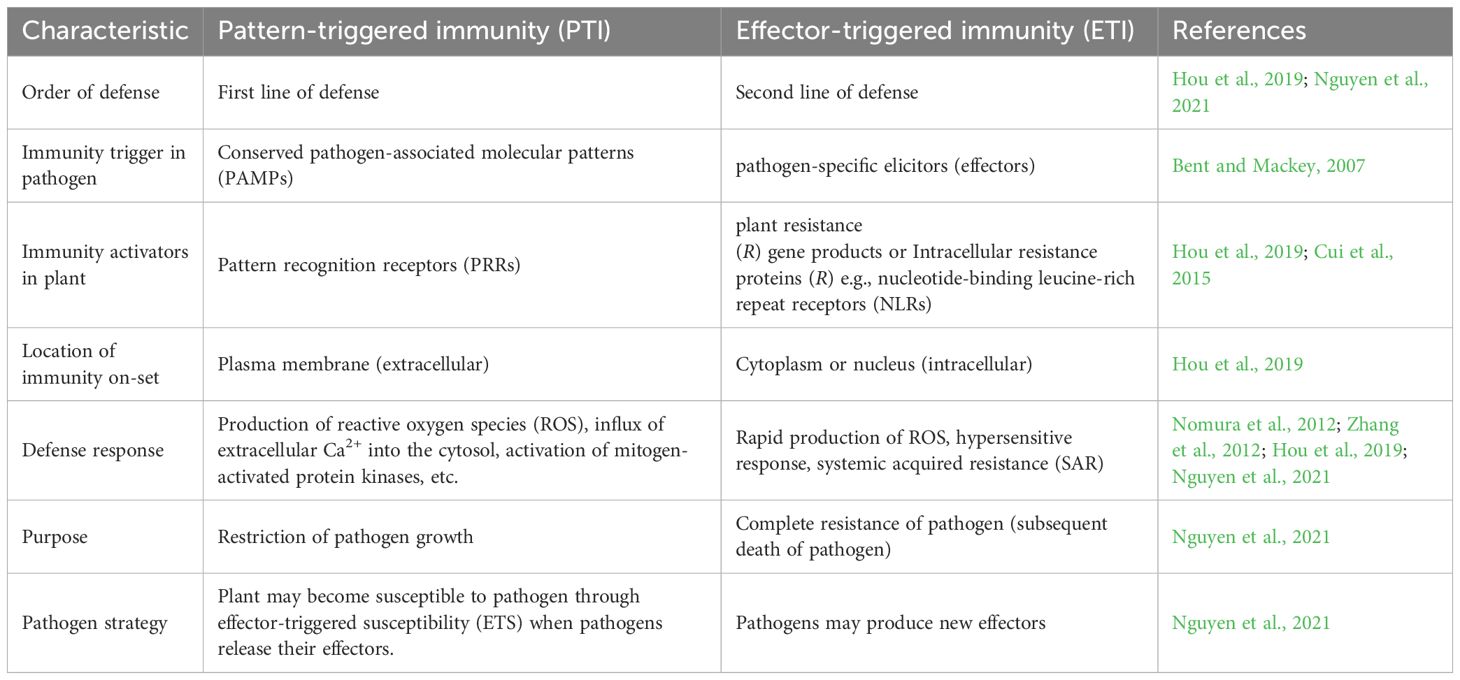 Understanding the molecular basis of host-pathogen interactions is key to developing disease-resistant crops and enhancing agricultural productivity (Ijaz et al., 2024). These interactions can be analyzed from two perspectives: identifying the virulence strategies of pathogens and deciphering host defense mechanisms (De Moraes Pontes et al., 2020). Plants have developed a complex immune system in order to defend themselves against any threat from pathogens. They use their innate immunity, made up of intracellular and cell surface receptors, to detect the molecular signatures (pathogen-associated molecular patterns[PAMPs]) used by pathogens to infect plants. PAMP-triggered immunity (PTI) effectively defends plants from a wide range of pathogens. Though, pathogens can subdue the host plant immune response by secreting their small proteins (effectors) into the host cell cytoplasm. When PTI is no longer effective due to the effect of pathogenic effectors, effector-triggered immunity (ETI) is activated to provide resistance to the host (Nguyen et al., 2021). Susceptibility or resistance of plants is determined by the interaction between effectors and the plant immune network. The plant immune system is a dynamic system that keeps evolving to defend plants against environmental threats Bhadauria and Zhao (2024). An overview of the two types of host immunity in plants is presented in Table 2.