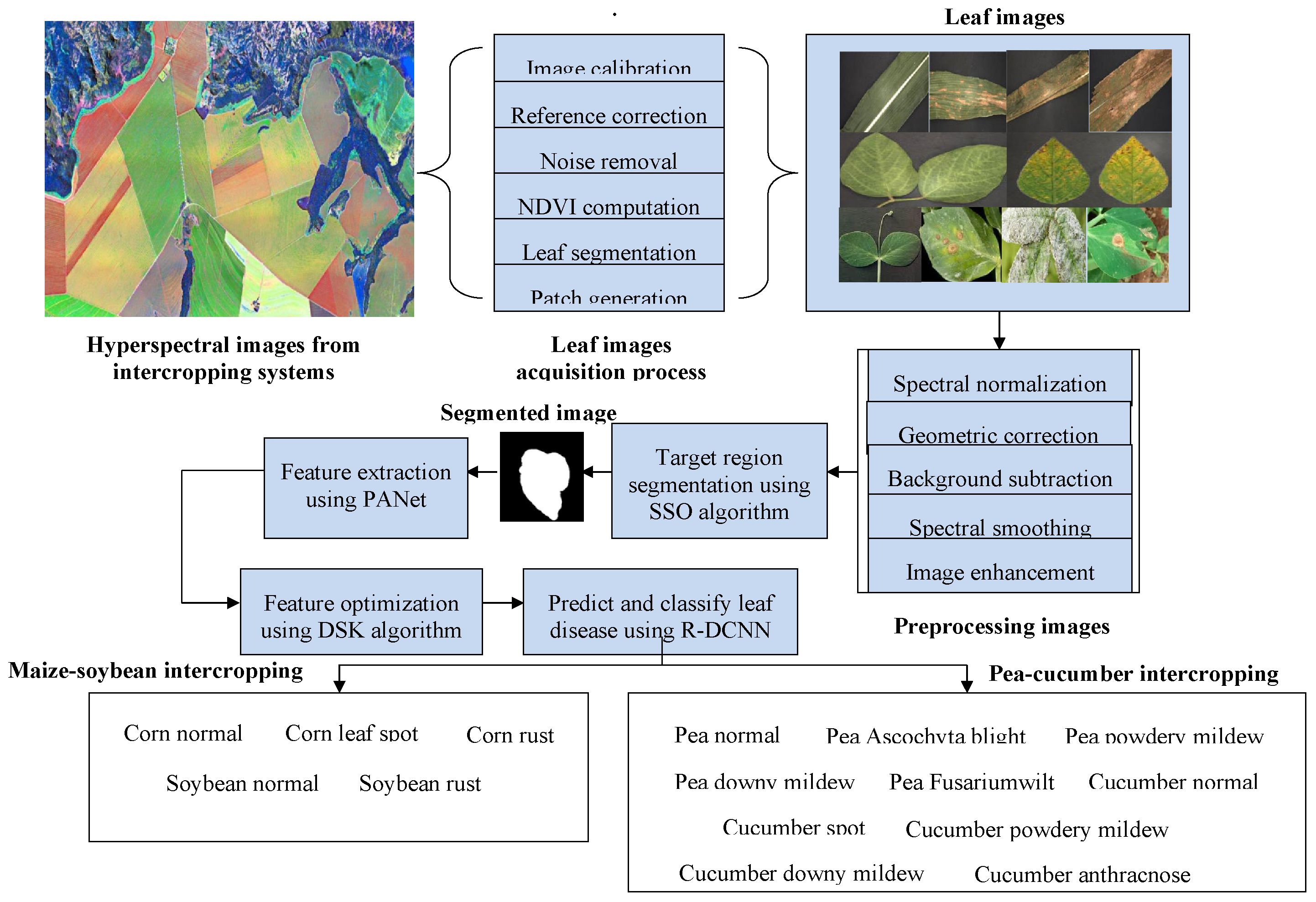 This study involves collecting hyperspectral images from Maize–soybean and pea–cucumber intercropping fields. Leaf samples, including both healthy and diseased ones, were captured under controlled lighting conditions using a hyperspectral imaging setup. The raw hyperspectral data underwent a series of preprocessing steps such as image calibration, noise removal, normalization, and enhancement to improve image quality. Leaf regions were segmented, and relevant features were extracted and refined. These processed features were then castoff to classify and classify various leaf ailments present in the intercropping systems. The overall architecture of the proposed smart intercropping system for leaf disease prediction is presented in Figure 2. Hyperspectral and leaf images are acquired from maize–soybean and pea–cucumber intercropping systems, where calibration, reference correction, noise removal, NDVI computation, leaf segmentation, and patch generation are applied to prepare the data. The acquired images undergo preprocessing steps such as spectral normalization, geometric correction, background subtraction, spectral smoothing, and image enhancement, ensuring uniform quality and reducing distortions. After preprocessing, the SSO algorithm segments the diseased regions from the healthy tissues, producing precise masks that highlight only the infected areas. These segmented regions are then processed through the phase attention fusion network (PANet) to extract discriminative deep features, while the dual-stage Kepler optimization (DSKO) algorithm reduces redundancy and optimizes the feature space. The refined features are classified using the random deep convolutional neural network (R-DCNN), which predicts crop-specific diseases. Within the maize–soybean intercropping system, the categories include normal, leaf spot, and rust, whereas in the pea–cucumber system, multiple diseases such as Ascochyta blight, powdery mildew, downy mildew, Fusarium wilt, cucumber spot, and anthracnose are identified. This integrated pipeline establishes a coherent flow from image acquisition and preprocessing to segmentation, feature extraction, optimization, and classification, thereby enabling accurate and scalable disease detection in diverse intercropping environments.