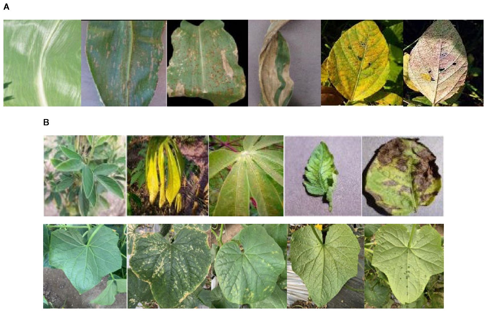 Figure 3. Sample leaf images from (A) Maize–soybean and (B) pea–cucumber intercropping fields with the disease class of corn normal, corn leaf spot, corn rust, corn hybrid, soybean normal, soybean rust” in Maize–soybean intercropping field; disease class of “pea normal, pea Ascochyta blight, pea powdery mildew, pea downy mildew, pea Fusarium wilt, cucumber normal, cucumber angular leaf spot, cucumber powdery mildew, cucumber downy mildew, and cucumber anthracnose” in pea–cucumber intercropping field.