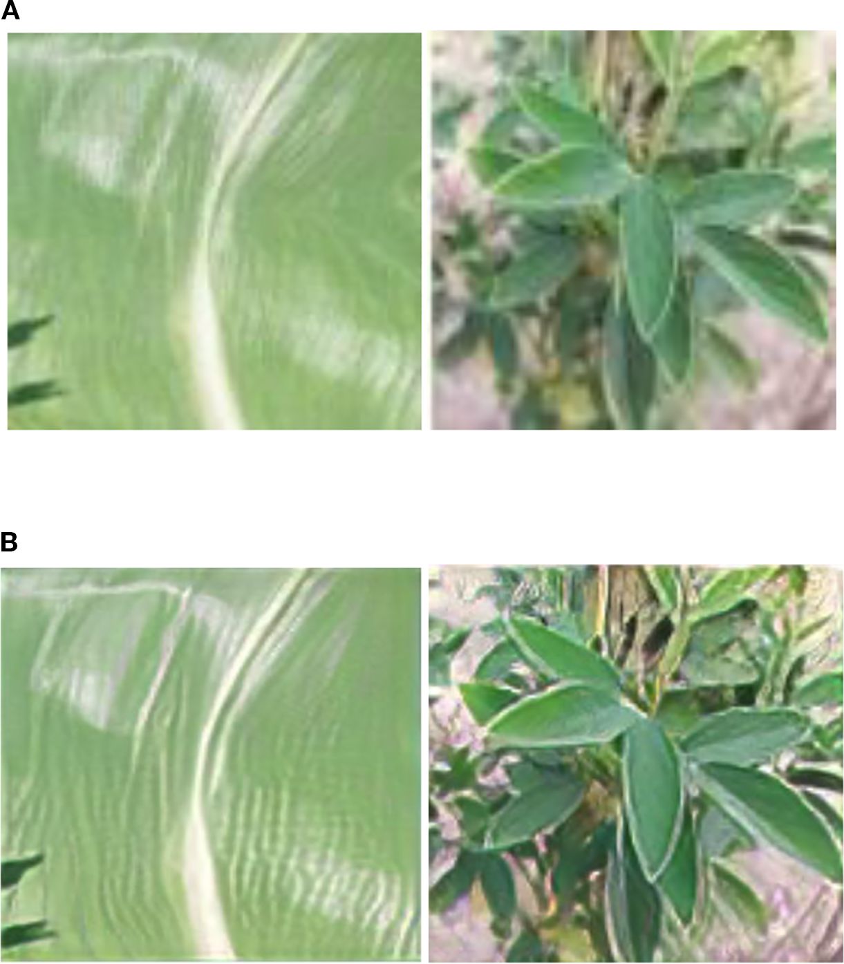 Figure 4. Example leaf images from the dataset: (A) raw input images of healthy and diseased leaves from maize–soybean and pea–cucumber intercropping systems; (B) corresponding preprocessed images after patch generation, normalization, and enhancement, illustrating the preparation of data for hyperspectral model training.