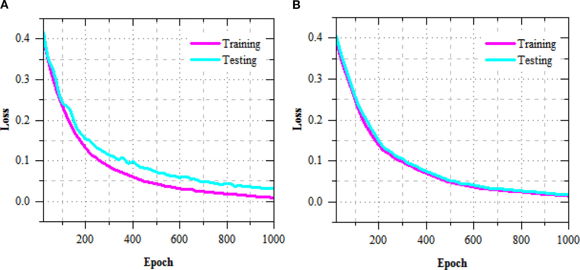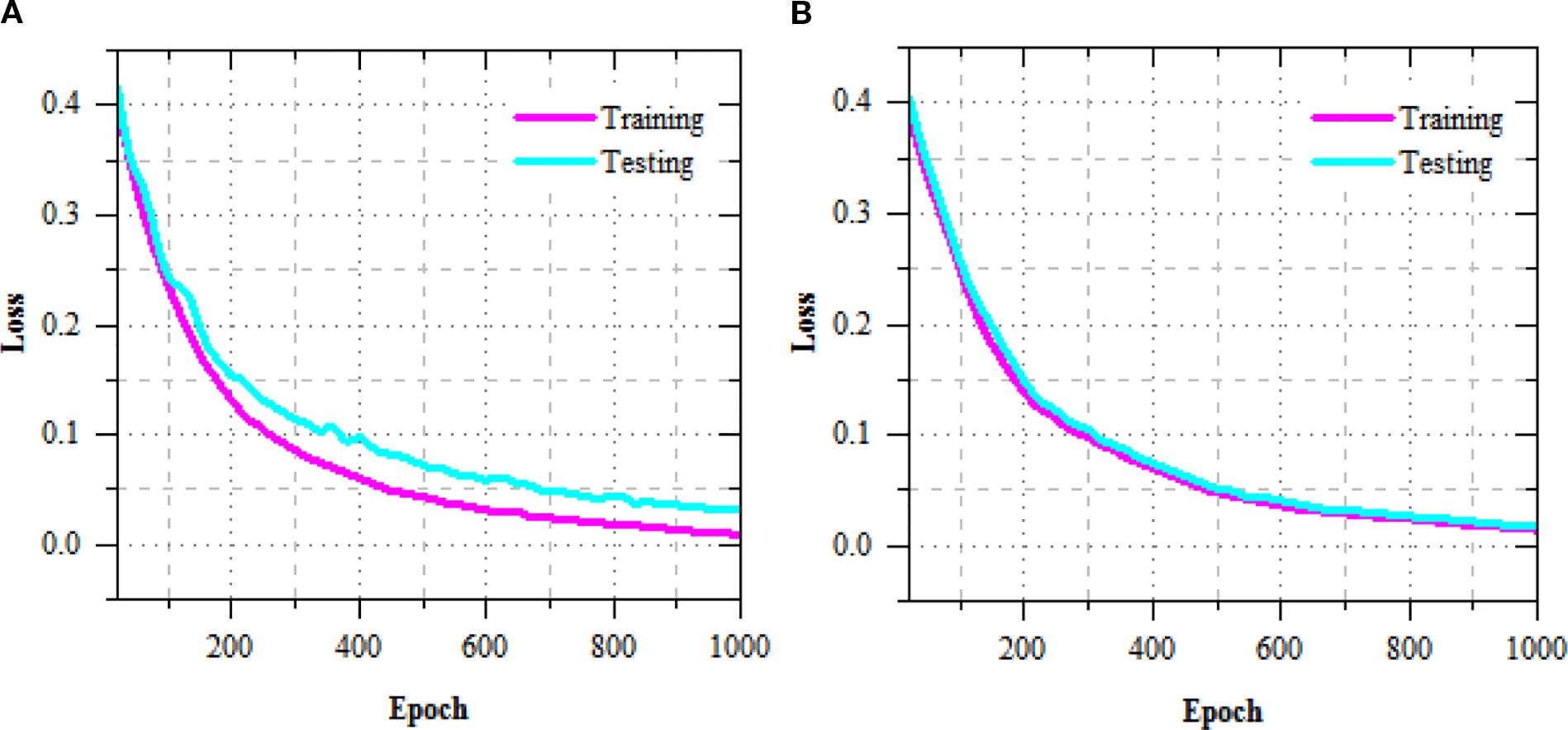 Figure 5. Training and testing loss performance of R-DCNN for leaf disease prediction on (A) Maize-soybean and (B) pea-cucumber intercropping fields.
