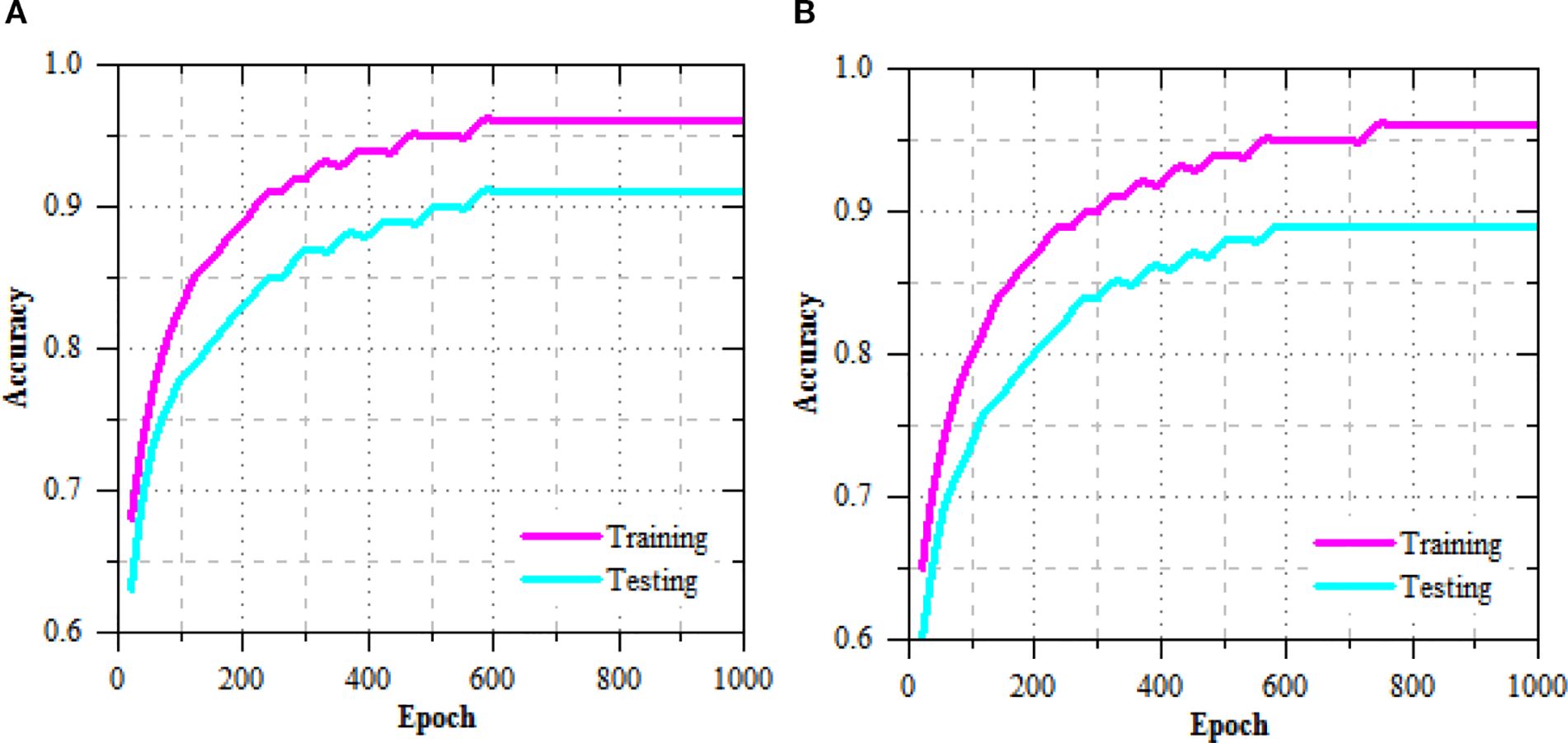 Figure 6. Training and testing accuracy performance of R-DCNN for leaf disease prediction on (A) Maize-soybean and (B) pea-cucumber intercropping fields.