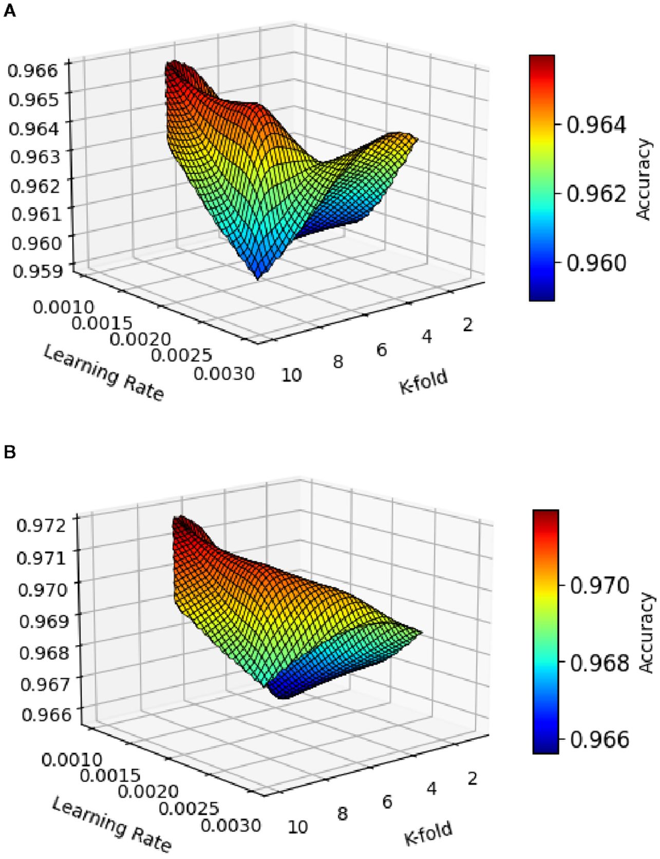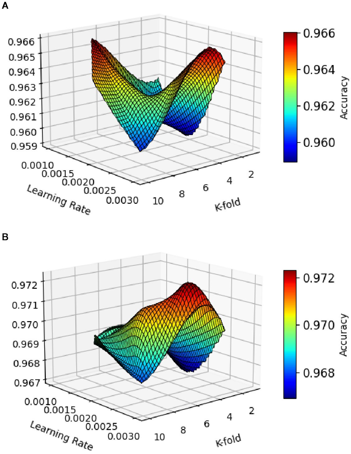 Figure 8. Accuracy results of leaf disease detection with varying learning rate of (A) PANet+R-DCNN and (B) PANet+DSKO+R-DCNN for pea-cucumber intercropping fields.