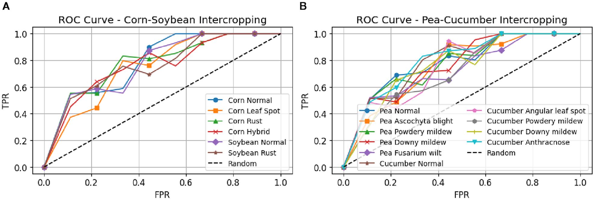 Figure 9. ROC curves for disease classification performance in intercropping systems. (A) Maize-Soybean intercropping field with classes (B) Pea-Cucumber intercropping field with classes for PANet+DSKO+R-DCNN model.