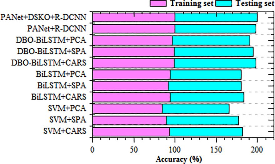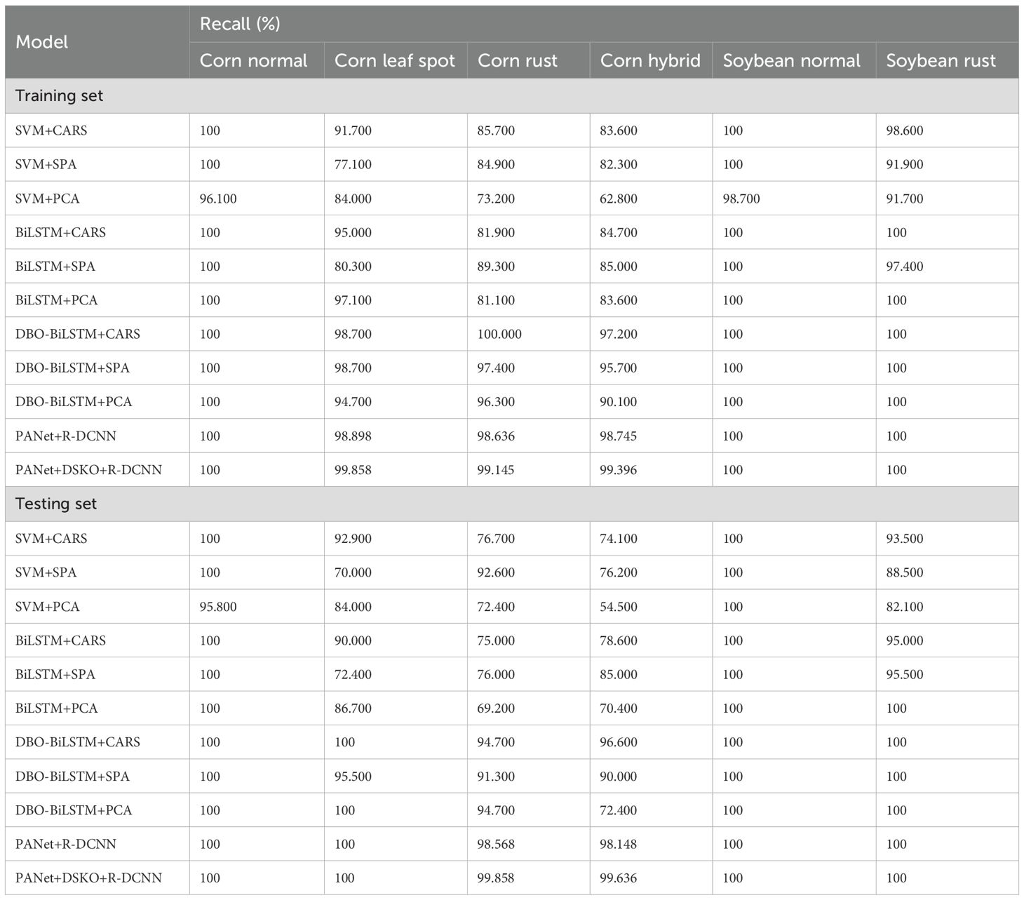 Table 7 describes the recall of proposed PANet+R-DCNN and PANet+DSKO+R-DCNN models is compared with the existing SOTA models such as SVM+CARS, SVM+SPA, SVM+PCA, BiLSTM+CARS, BiLSTM+SPA, BiLSTM+PCA, DBO-BiLSTM+CARS, DBO-BiLSTM+SPA and DBO-BiLSTM+PCA. These results represent major improvements of up to 5.16% in Corn rust and 3.03% in Corn hybrid compared to even the top-performing DBO-BiLSTM models. PANet+R-DCNN yielded 98.568% recall in Corn rust and 98.148% in Corn hybrid, achieving over 3.86% and 1.54% gains respectively when compared to earlier baselines. Figure 10 describes the accuracy results comparison of proposed and SOTA models on Maize-soybean intercropping system. For the training phase, the proposed model PANet+DSKO+R-DCNN achieved the highest accuracy of 99.858%. Connected to SVM+CARS which recorded 93.6%, there is improvement of 6.66%. Over SVM+SPA and SVM+PCA with accuracy of 89.6% and 84.4% respectively, the gains are 10.26% and 15.26%. PANet+R-DCNN model recorded 98.748% the improvement is 1.05%, proving the effectiveness of the DSKO enhancement.
