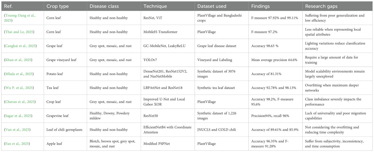 Table 1. Summary of research gaps from existing state-of-art works on leaf disease detection and classification.