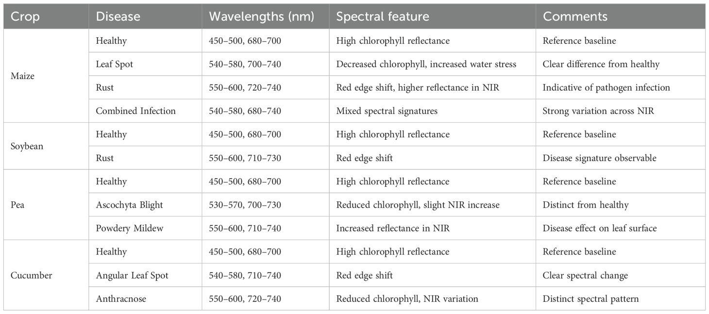 Table 2. Significant hyperspectral wavelengths distinguishing healthy and diseased leaves across maize–soybean and pea–cucumber intercropping systems, highlighting spectral variations associated with different plant diseases.