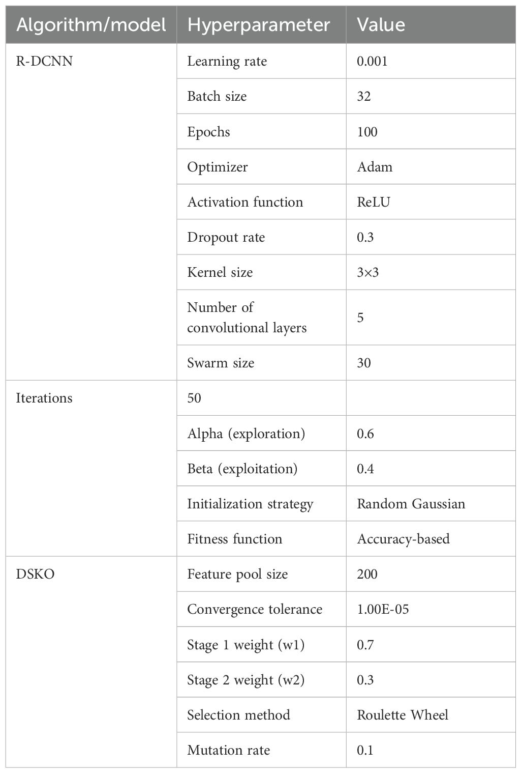 This section presents the performance outcomes and comparative evaluation of the proposed model across multiple simulation scenarios. The evaluation focuses on: (i) quality of target region segmentation, (ii) effectiveness of deep feature extraction, (iii) impact of feature optimization, and (iv) comparison with existing state-of-the-art (SOTA) models for leaf disease prediction in maize–soybean and pea–cucumber intercropping systems. All experiments were conducted using the publicly available hyperspectral dataset curated by Liu et al. (2024), which contains samples from maize–soybean and pea–cucumber intercropping systems in China. This dataset was used for training, validation, and testing of the proposed framework. Table 4 summarizes the key hyperparameters and model configurations. The R-DCNN classifier was trained with a learning rate of 0.001, batch size of 32, and 100 epochs using the Adam optimizer. The model employed ReLU activation, a dropout rate of 0.3, a 3×3 kernel size, and five convolutional layers. The SSO algorithm used a swarm size of 30, 50 iterations, and exploration (α) and exploitation (β) factors of 0.6 and 0.4, respectively, initialized via a random Gaussian strategy with an accuracy-based fitness function. The DSKO module operated with a feature pool size of 200, a convergence tolerance of 1.00E–05, and dual-stage weighting factors of w1 = 0.7 and w2 = 0.3, ensuring optimized feature selection.