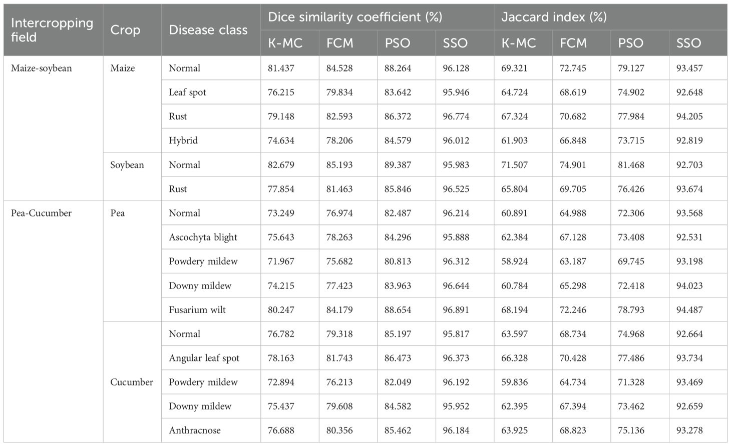 The results of the SSO algorithm was linked with present segmentation algorithms—K-means clustering (K-MC), fuzzy C-means (FCM), and particle swarm optimization (PSO)—using dice similarity coefficient and Jaccard index as evaluation metrics. Table 5 presents the comparative results of segmentation algorithms for leaf disease detection in intercropping systems. In the Corn-Soybean field, the SSO algorithm consistently outperformed K-MC, FCM, and PSO across all classes. Dice coefficient improvements ranged from 16.05% to 28.68%, while the Jaccard index increased by 29.74% to 49.93%. Similarly, in the Pea-Cucumber field, SSO achieved notable gains, with Dice increases up to 31.28% and Jaccard improvements reaching 53.75% over existing methods. These results highlight SSO’s superior segmentation accuracy for multi-crop disease detection. In the Pea-Cucumber field, SSO consistently outperformed K-MC, FCM, and PSO across all disease classes. Dice coefficient improvements ranged from 20.76% to 33.79% for pea diseases and 22.79% to 32.00% for cucumber diseases. Corresponding Jaccard index gains varied between 38.52% to 63.34% in pea and 41.30% to 55.44% in cucumber. These results highlight SSO’s superior segmentation performance, achieving 15% to over 60% improvements across metrics, ensuring highly accurate disease detection in intercropping.