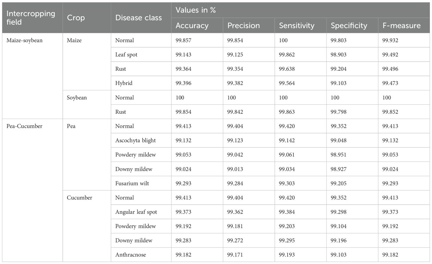 Table 6 describes the performance evaluation of the proposed model for leaf disease detection in maize–soybean and pea–cucumber intercropping systems demonstrate consistently high accuracy across all disease classes. In the Maize–soybean field, normal maize leaves achieved an accuracy of 99.857%, with precision, sensitivity, specificity, and F-measure values all above 99.8%, indicating almost perfect classification. Leaf spot detection showed slight reductions in accuracy and specificity, while precision, sensitivity, and F-measure remained above 99.1%, highlighting minimal performance degradation. Rust-infected maize leaves achieved 99.364% accuracy, with all other metrics exceeding 99.2%, reflecting robust detection capabilities. Hybrid maize leaves demonstrated 99.396% accuracy, with minor variations in other metrics, showing that the model can accurately handle mixed infections. Soybean leaves, both normal and rust-infected, reached near-perfect scores, with normal leaves attaining 100% across all metrics and rust-infected leaves achieving 99.854% accuracy, with a slight decrease of 0.146% compared to normal leaves. In the Pea–cucumber field, normal pea leaves showed 99.413% accuracy, with corresponding high values for precision, sensitivity, specificity, and F-measure, reflecting consistent performance. Disease classes such as Ascochyta blight, powdery mildew, downy mildew, and Fusarium wilt exhibited accuracies of 99.132%, 99.053%, 99.024%, and 99.293%, respectively, representing minor reductions of 0.281%, 0.36%, 0.389%, and 0.12% compared to normal pea leaves, while maintaining high detection reliability. Similarly, cucumber leaves demonstrated strong performance, with normal leaves at 99.413% accuracy. Angular leaf spot, powdery mildew, downy mildew, and anthracnose achieved accuracies of 99.373%, 99.192%, 99.283%, and 99.182%, respectively, showing marginal decreases ranging from 0.041% to 0.221% compared to normal leaves. The results indicate that the model consistently delivers robust and reliable classification, with improvements ranging from 0.041% to 0.281% compared to the next best-performing disease classes, highlighting its effectiveness in real-world hyperspectral leaf disease detection scenarios.