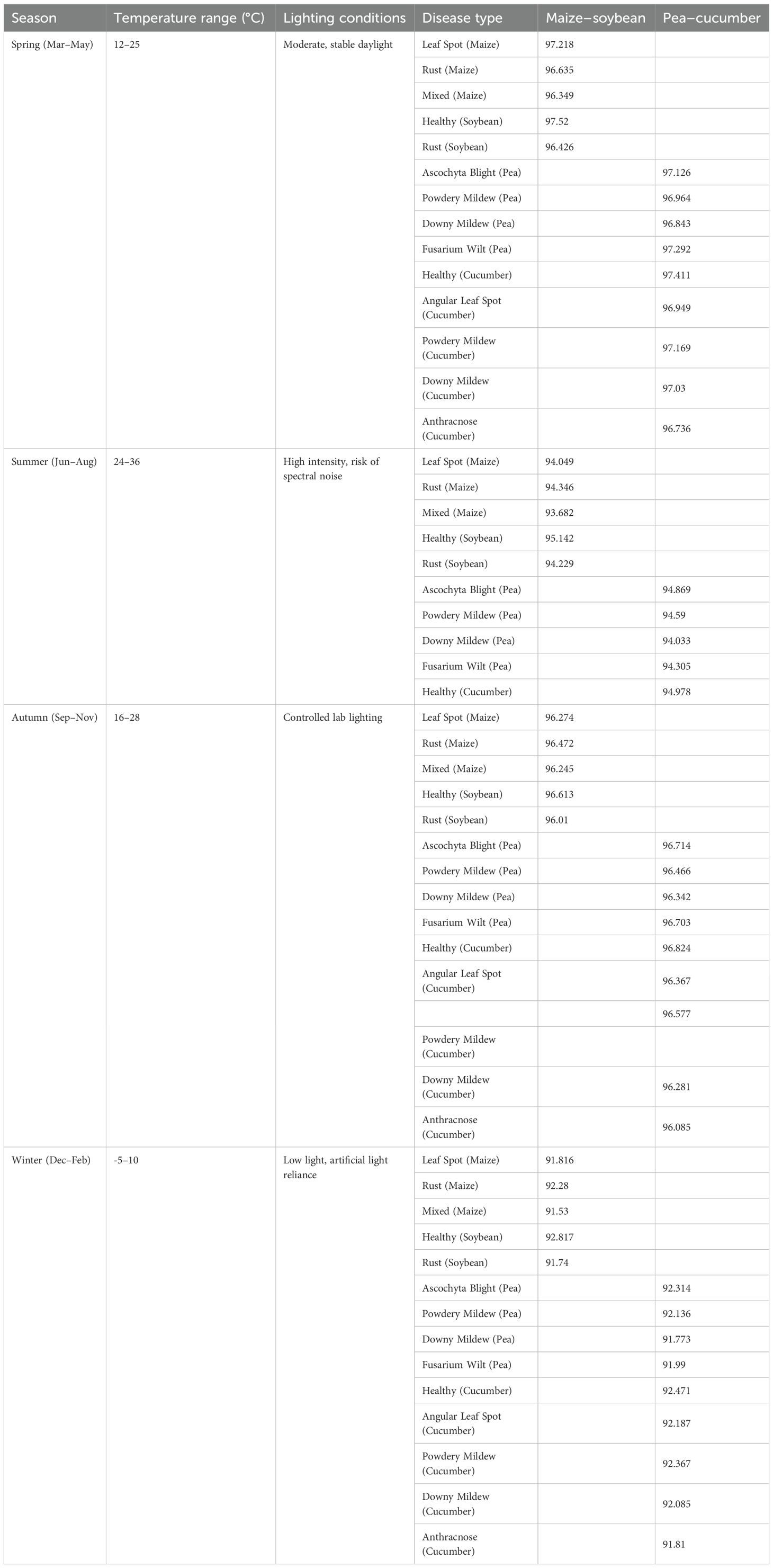 Table 8. Seasonal variations in disease detection accuracy (%) for Maize–soybean and pea–cucumber intercropping systems.