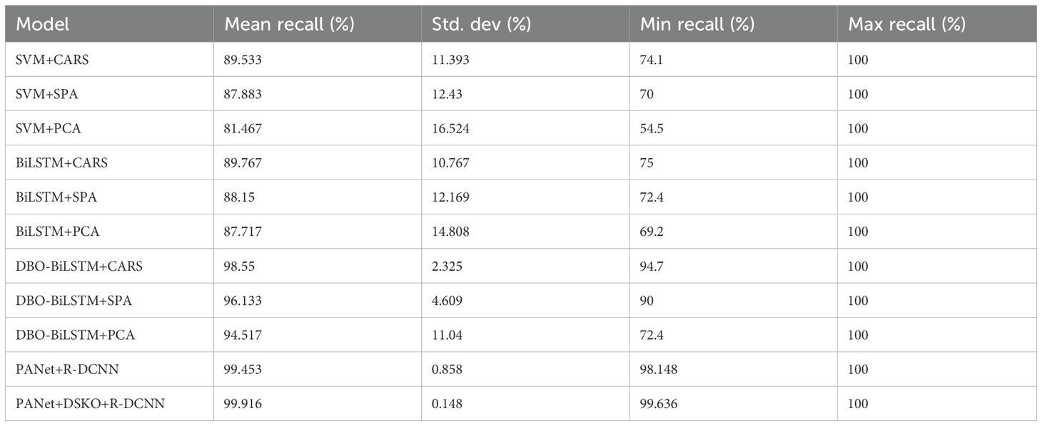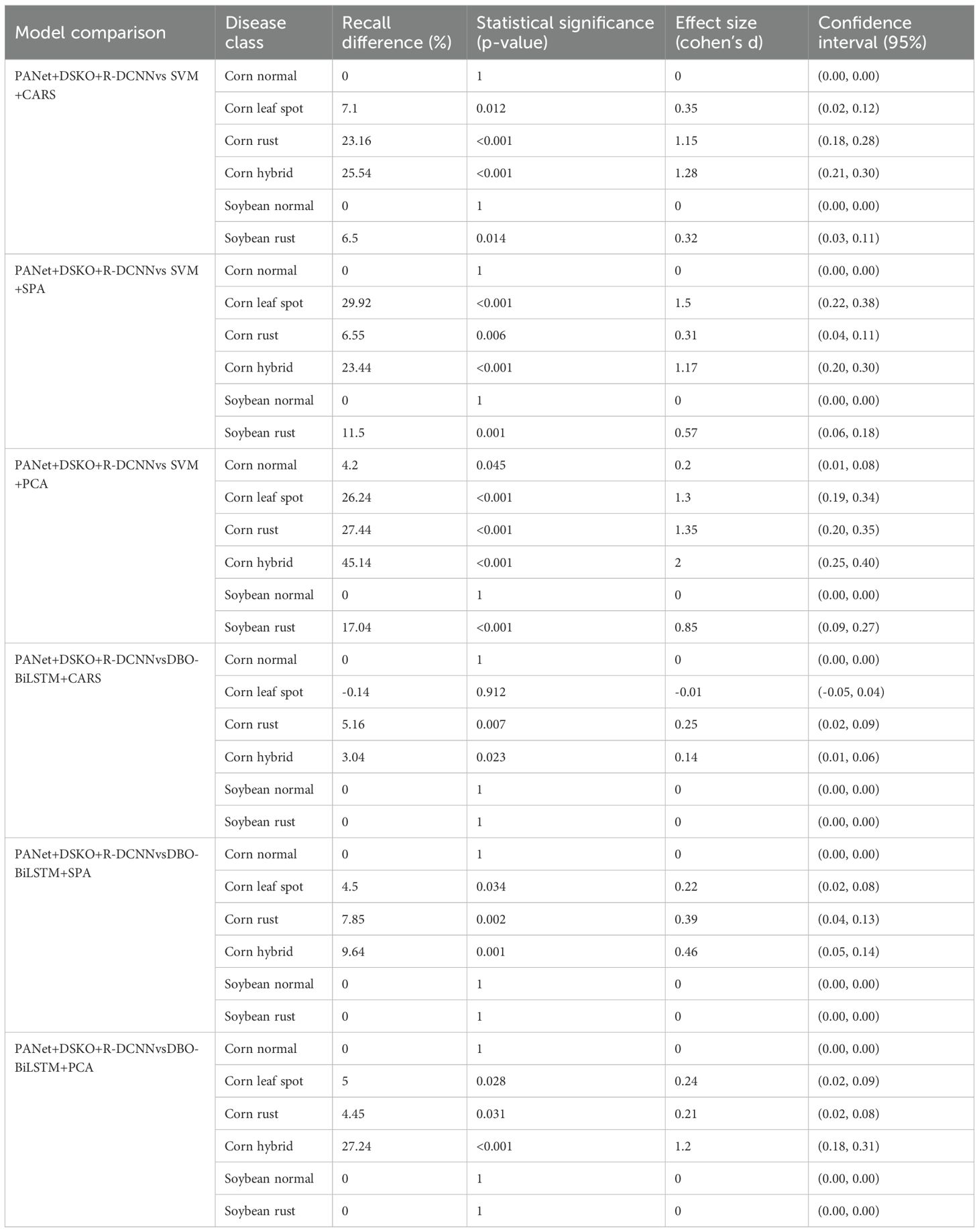 The descriptive statistics of recall performance for various models in the Maize-Soybean intercropping system, as shown in Table 9, reveal that the proposed PANet+DSKO+R-DCNN model achieved the highest mean recall of 99.916%, with minimal variability (Std. Dev. 0.148%) and a maximum recall of 100%, indicating highly consistent performance across all disease classes. The PANet+R-DCNN model also performed well with a mean recall of 99.453%, followed by DBO-BiLSTM+CARS with 98.55%. In contrast, classical models such as SVM+PCA and SVM+SPA showed lower mean recall of 81.467% and 87.883%, respectively, with much higher standard deviations, reflecting greater inconsistency and reduced reliability in detecting leaf diseases. The comparative analysis in Table 10 highlights the superiority of PANet+DSKO+R-DCNN over the state-of-the-art models. When compared to SVM+CARS, the proposed model showed the highest improvement in Corn hybrid by 25.54% and Corn rust by 23.16%, while Corn leaf spot and Soybean rust improved by 7.1% and 6.5%, respectively. There was no change in Corn normal and Soybean normal recall. Compared to SVM+SPA, the improvements were substantial, with Corn leaf spot increasing by 29.92%, Corn hybrid by 23.44%, and Soybean rust by 11.5%, while Corn rust improved by 6.55% and Corn normal remained unchanged. Against SVM+PCA, the proposed model achieved remarkable gains of 45.14% for Corn hybrid, 27.44% for Corn rust, 26.24% for Corn leaf spot, and 17.04% for Soybean rust, with minor improvement of 4.2% for Corn normal. Compared with DBO-BiLSTM+CARS, PANet+DSKO+R-DCNN showed moderate improvements, including 5.16% for Corn rust, 3.04% for Corn hybrid, and negligible decrease of 0.14% in Corn leaf spot. Similarly, against DBO-BiLSTM+SPA, the improvements were 9.64% in Corn hybrid, 7.85% in Corn rust, and 4.5% in Corn leaf spot, while the other classes remained unchanged. Compared to DBO-BiLSTM+PCA, the proposed model achieved 27.24% improvement in Corn hybrid, 5% in Corn leaf spot, 4.45% in Corn rust, and no change in other classes. The PANet+DSKO+R-DCNN model consistently outperformed both classical SVM-based models and deep learning-based SOTA models, demonstrating its robustness and effectiveness in accurately detecting leaf diseases across all classes in Maize-Soybean intercropping systems, with improvements ranging from minor gains of 4.2% to major increases of 45.14%.