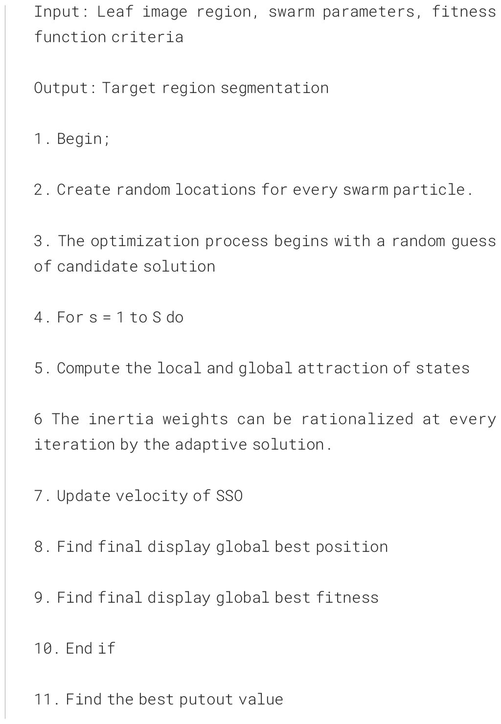 where, d2 is an extra hastening factor for the variety period and R5 is a random value. stands for the location in the cluster where the particle’s neighborhood diversity is maximized. The research gaps discussed in Table 1. Algorithm 1 describes the working process of target region segmentation using SSO.