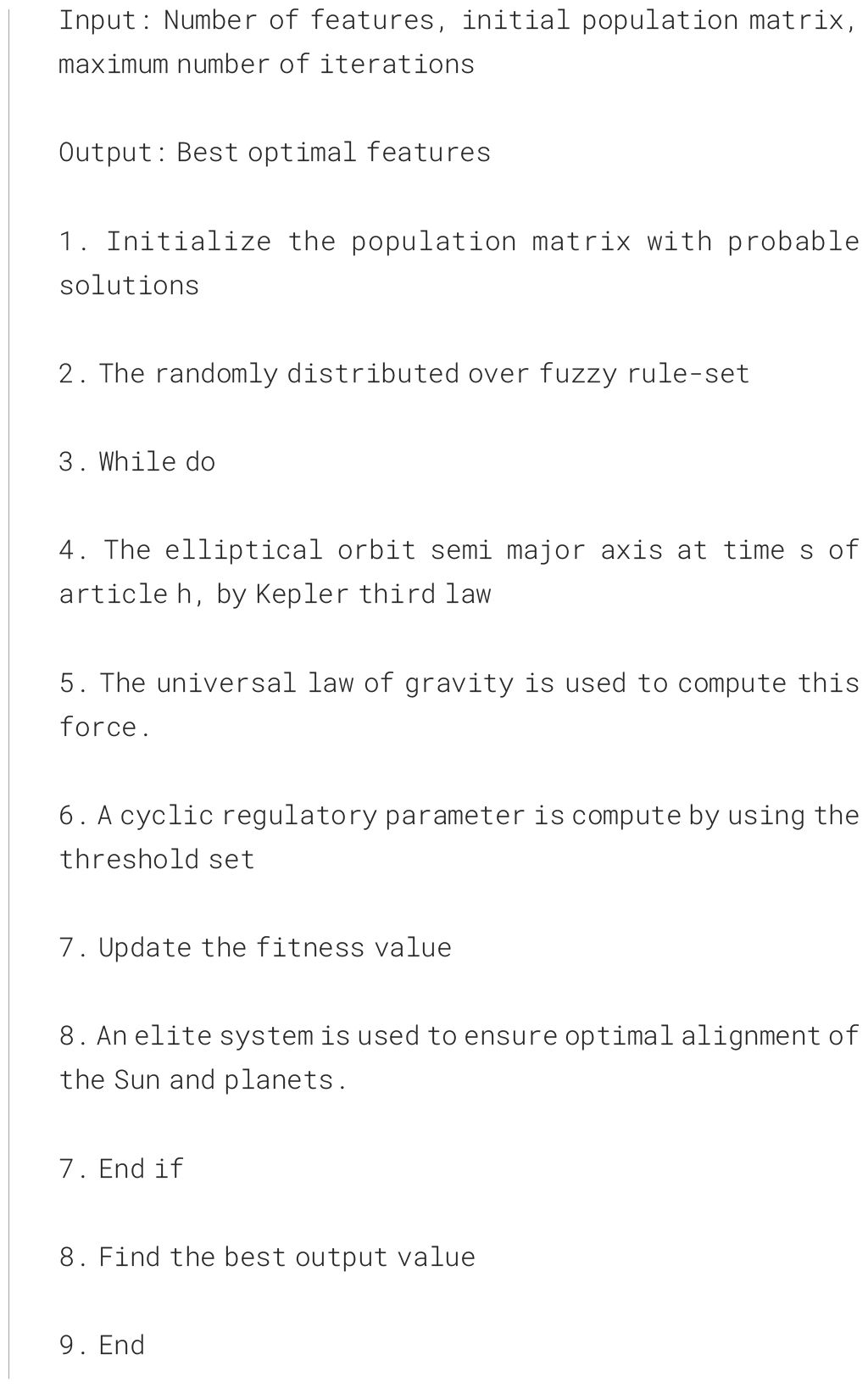 In the context of identifying plant diseases, feature extraction often leads to a database that contains a variety of in-depth features. However, not all of these features are relevant or necessary for the classification of diseases. Feature optimization aims to reduce the dimensions of the dataset by identifying and retaining only the most important features that contribute efficiently to the classification task. By removing the less useful features, the model becomes more efficient, faster, and less prone to overfitting, thereby improving its performance and generalization capability. To optimize the features in this work, the two-stage Kepler optimization algorithm (DSKO) is used. DSKO is a metaheuristic algorithm inspired by nature and based on Kepler’s laws of planetary motion, which determine the movement of celestial bodies in space (Cai et al., 2025). The populace size is the numeral of planets that reflect the optimization problem’s decision parameters, is dispersed randomly over fuzzy sizes in the manner described in Equation 9: