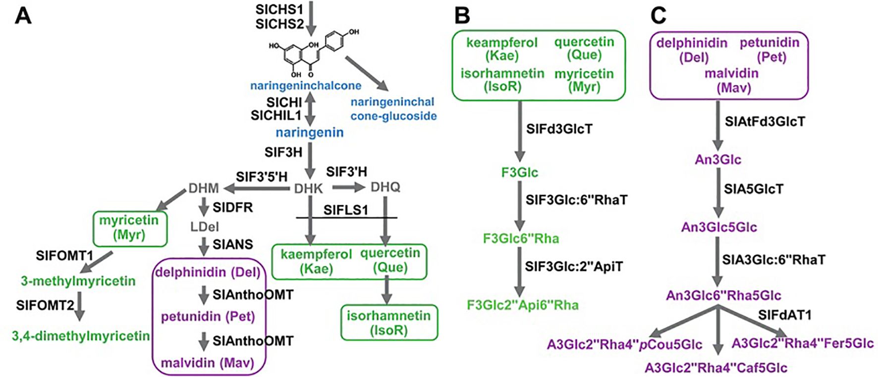 Recent advances in molecular biology have revolutionized our ability to dissect and manipulate this pathway. CRISPR-Cas9 gene editing has been instrumental, moving beyond correlation to direct causation by knocking out specific genes (e.g., CHS1, DFR) to confirm their function and create tomatoes with altered flavonoid profiles. Conversely, the targeted activation of key transcription factors like SIAN2 or SIMYB75 using CRISPR activation (CRISPRa) systems or traditional transgenesis has successfully engineered tomatoes with dramatically enhanced anthocyanin accumulation, turning the fruit purple and boosting its antioxidant capacity. Furthermore, RNA interference (RNAi) has been used to silence specific genes, fine-tuning the pathway to reduce undesirable compounds or shunt flux towards preferred flavonoids. Beyond single-gene manipulation, multi-omics approaches integrating genomics, transcriptomics, metabolomics, and proteomics have provided a systems level understanding. By analyzing the entire pathway simultaneously, researchers can identify all players involved, uncover novel regulatory nodes, and understand how environmental factors influence flavonoid output. Virus-Induced Gene Silencing (VIGS) remains a rapid, powerful tool for transiently knocking down gene expression in tomato fruits, allowing for high-throughput functional screening of candidate genes without the need for stable transformation. In summary, the flavonoid pathway in tomato is a well-defined genetic and enzymatic network. The synergy between classical biochemistry and cutting-edge molecular techniques particularly CRISPR-Cas9 and multi-omics integration has not only demystified the roles of key genes and enzymes but has also empowered breeders and biotechnologists to precisely engineer tomato fruits. This paves the way for developing next generation tomato varieties with enhanced nutritional value, improved stress resilience, and novel visual and health-promoting traits tailored to meet consumer and agricultural demands.