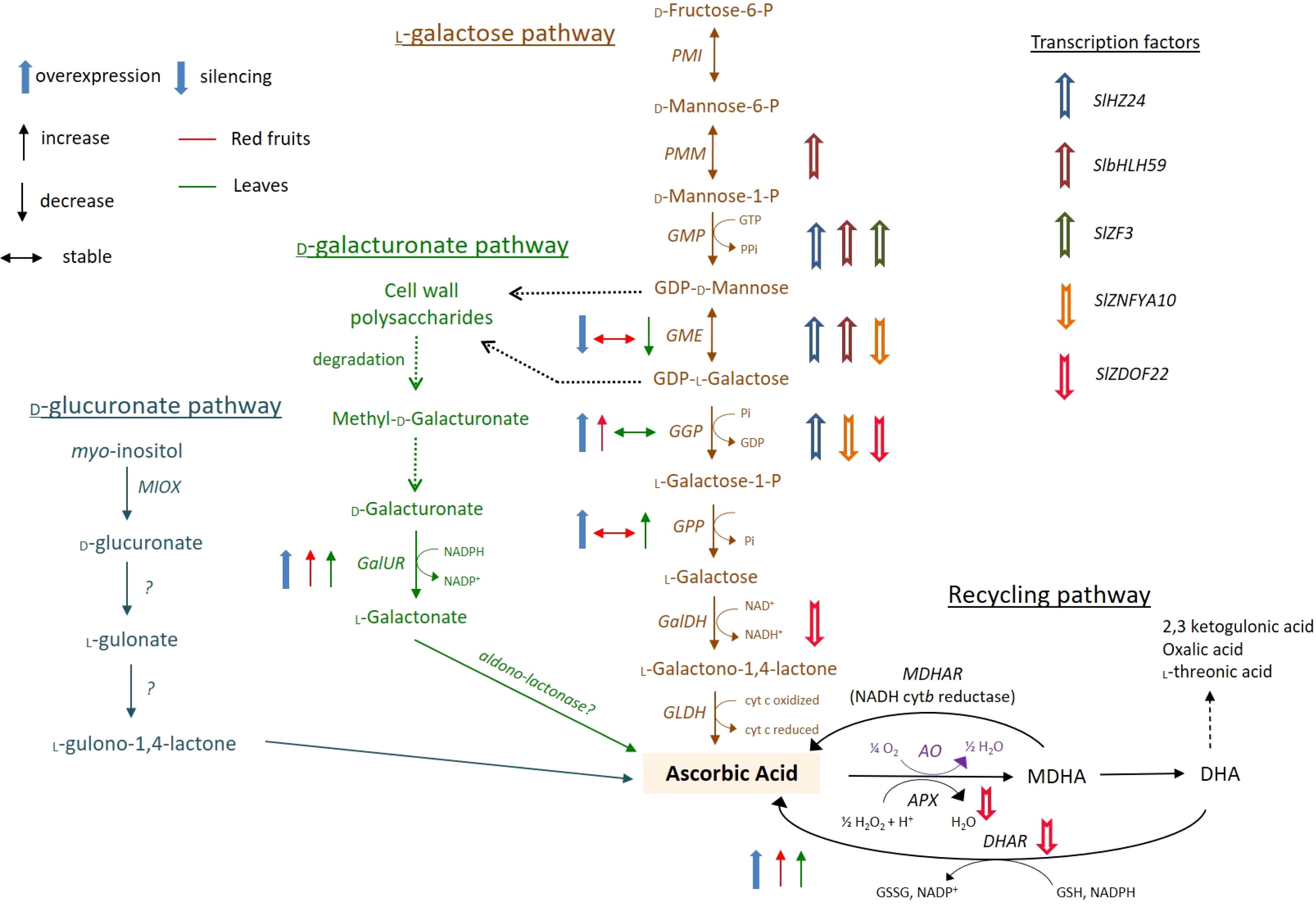 The transcriptional regulation of AsA biosynthesis, recycling, and degradation plays a pivotal role in determining its accumulation in tomato fruits. Among the most important enzymes in the AsA metabolic pathway are GDP-L-galactose phosphorylase (GGP), GDP-D-mannose epimerase (GME), and L-galactono-1,4-lactone dehydrogenase (GLDH). They respond to light, abiotic stress, and hormone cues and are tightly controlled by transcription factors (TFs) such as SlHY5, SlAREB, and SlNAC (Castro et al., 2023; Asa, 2025). Recent advances in CRISPR/Cas9-mediated genome editing and omics approaches have unveiled novel regulatory networks, providing potential strategies for enhancing vitamin C content in tomatoes.
