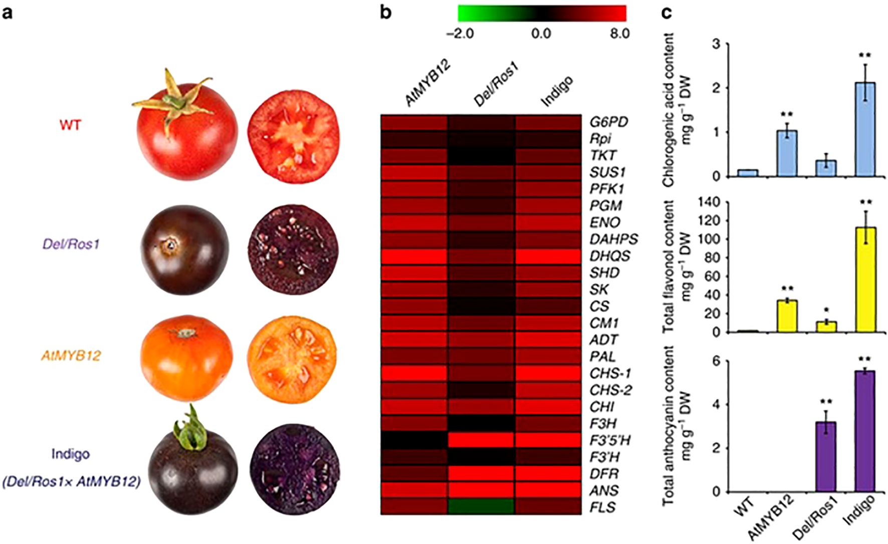 Figure 6. Flavonoid content and genes used in biosynthesis in different tomato phenotypes (Zhang et al., 2015). Where (a): tomato phenotypes; (b): RT-qPCR; (c): content of the phenylpropanoids. * significant value, ** high significant value.