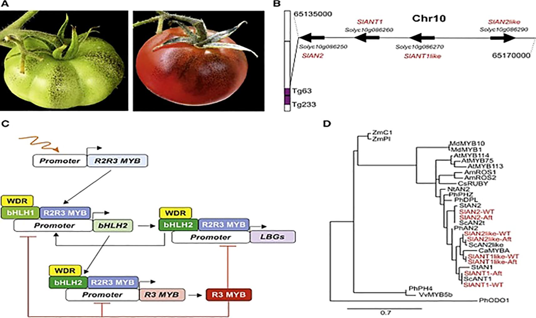 Figure 7. Phytochemicals Synthesis in Aft Tomato (Colanero et al., 2020). Where (A) Aft tomato fruit at mature and ripening stage; (B) Chromosome 10 had encoding genes; (C) Regulatory mechanism of phytochemicals synthesis; (D) Phylogenetic tree among R2R3 MYB proteins and R2R3 MYB factors.