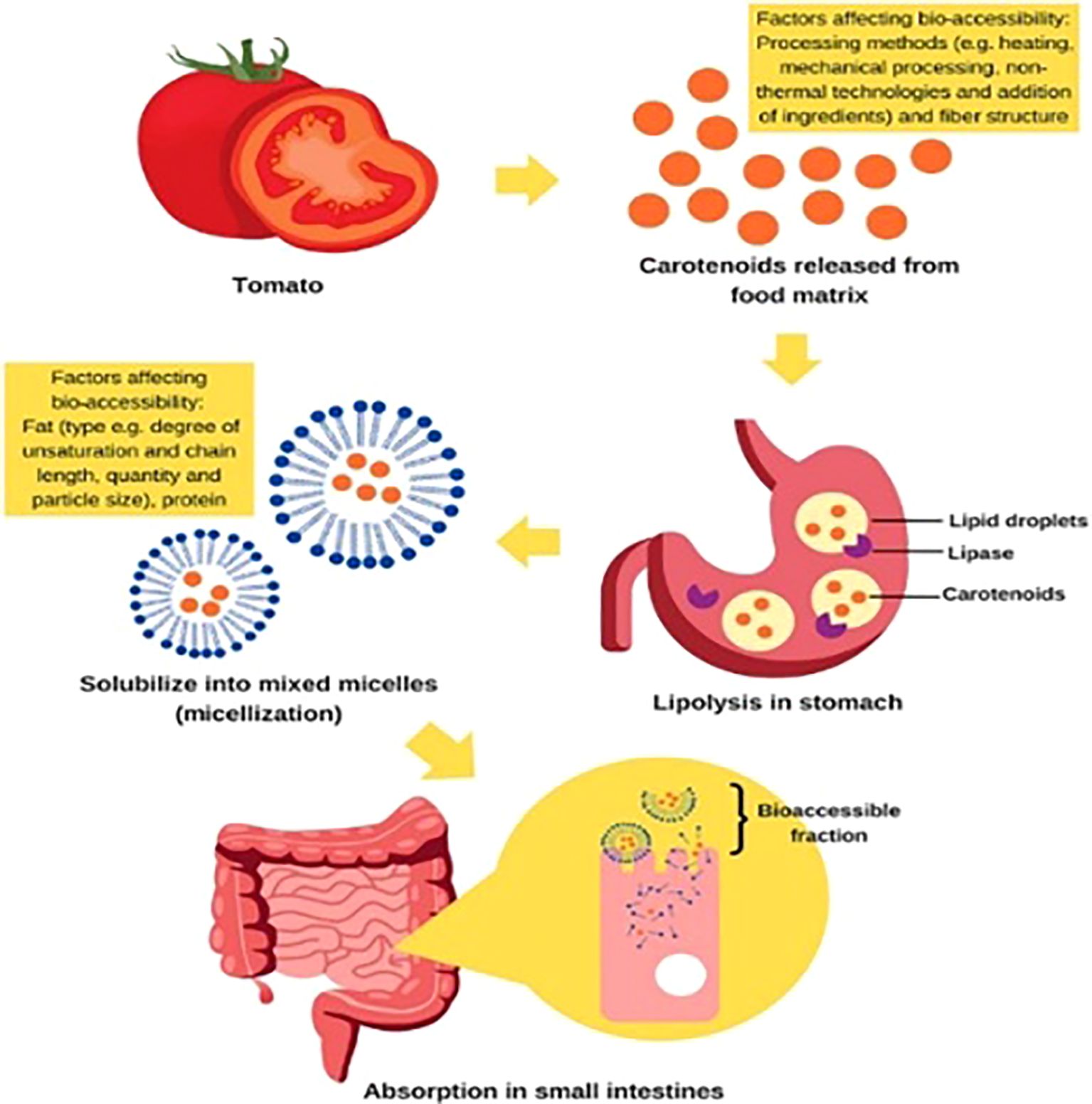 The food matrix plays a crucial role, as carotenoids in plant chromoplasts are often bound to proteins or fibers, requiring mechanical (e.g., chewing, homogenization) and thermal processing to enhance release (Raikos, 2017). Digestive factors, such as gastric lipase activity and emulsification by bile salts, significantly influence carotenoid solubilization in mixed micelles, which is essential for absorption (McClements, 2018). The presence of dietary lipids (5–10 g per meal) is critical for carotenoid dissolution, while excessive fiber may hinder micelle formation (Verkempinck, 2018). Furthermore, processing techniques (cooking, high-pressure homogenization, and fermentation) can disrupt cell walls, improving carotenoid extractability. Understanding these factors is essential for optimizing dietary strategies and food processing methods to enhance carotenoid bioavailability.