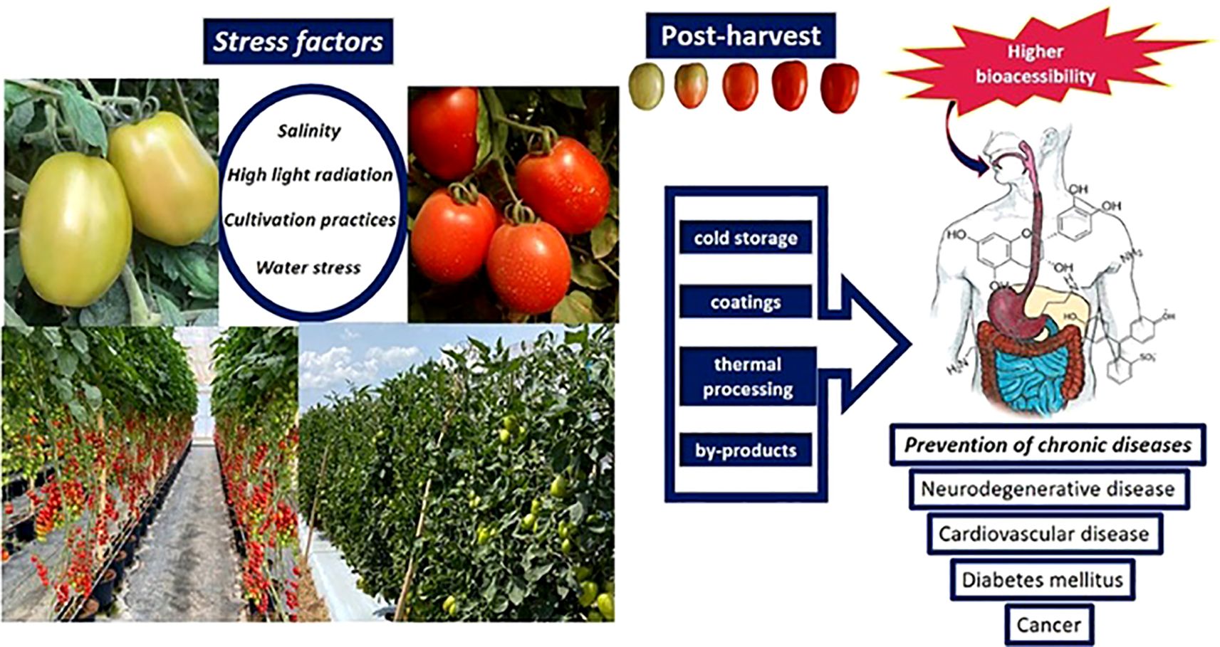 Tomatoes are a powerhouse of bioactive compounds with multifaceted health benefits, ranging from cardiovascular protection to cancer prevention. Regular consumption, especially in processed forms with healthy fats, maximizes their therapeutic potential. Further research continues to uncover novel mechanisms by which these compounds promote health, reinforcing tomatoes as a functional food in disease prevention and longevity, Figure 9 shows the impact of biotic and abiotic variables on tomato bioactive components’ bio-accessibility and bioavailability.