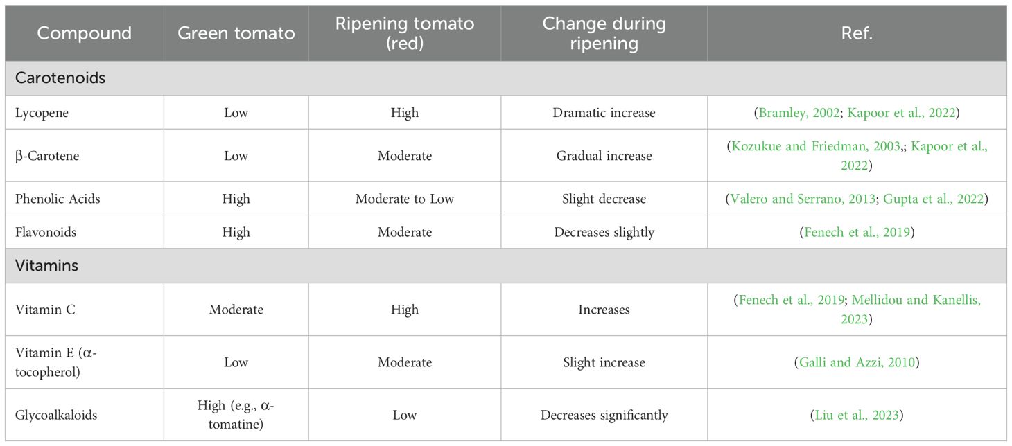Tomatoes (Solanum lycopersicum) have a wide range of bioactive chemicals with important nutritional and health benefits. Carotenoids (including lycopene and β-carotene), phenolic acids, flavonoids, vitamins C and E, and glycoalkaloids are responsible for the fruit’s anti-inflammatory, anti-cancer, and antioxidant qualities (Figure 1). Genetic cultivar, ripening stage, and agronomic conditions all influence the composition and concentration of these bioactive compounds, which are highly variable. For instance, lycopene, the predominant carotenoid responsible for tomatoes’ red colour, accumulates predominantly during the later stages of ripening, while certain flavonoids and chlorogenic acid levels may peak earlier. Environmental factors, including light exposure, temperature, soil quality, and water availability, further modulate phytochemical profiles, with organic cultivation and stress conditions (e.g., drought or salinity) often enhancing secondary metabolite production. Additionally, postharvest handling and processing methods (e.g., thermal treatment) can alter bioavailability and bioactivity. Understanding these dynamics is crucial for optimizing tomato production to maximize health benefits and for developing functional foods or nutraceuticals. The concentration of these phytochemicals varies significantly between green and ripening stages, influenced by biochemical and enzymatic changes during maturation as shown in Table 1. Lycopene, the predominant carotenoid in ripe tomatoes, increases dramatically during ripening due to the upregulation of lycopene biosynthesis pathways (Bramley, 2002; Zhu et al., 2022), while β-carotene levels may show a more gradual rise (Kozukue and Friedman, 2003; Kapoor et al., 2022). Phenolic acids and flavonoids, which are key antioxidants, often peak at intermediate ripening stages, as their synthesis is modulated by both developmental cues and environmental factors (Valero and Serrano, 2013). Vitamin C (ascorbic acid) tends to accumulate progressively with ripening (Fenech et al., 2019), whereas vitamin E (tocopherols) may exhibit a more stable or slightly declining trend (Galli and Azzi, 2010). Glycoalkaloids, such as α-tomatine, are typically higher in green tomatoes and decline as the fruit matures, meaning that glycoalkaloids play a role like a defense mechanism shift (Friedman, 2002; Faria-Silva et al., 2022). This dynamic profile of bioactive compounds highlights the importance of harvest timing in optimizing nutritional quality. Understanding these metabolic changes provides insights into breeding strategies and postharvest practices aimed at enhancing the health benefits of tomatoes for human consumption.