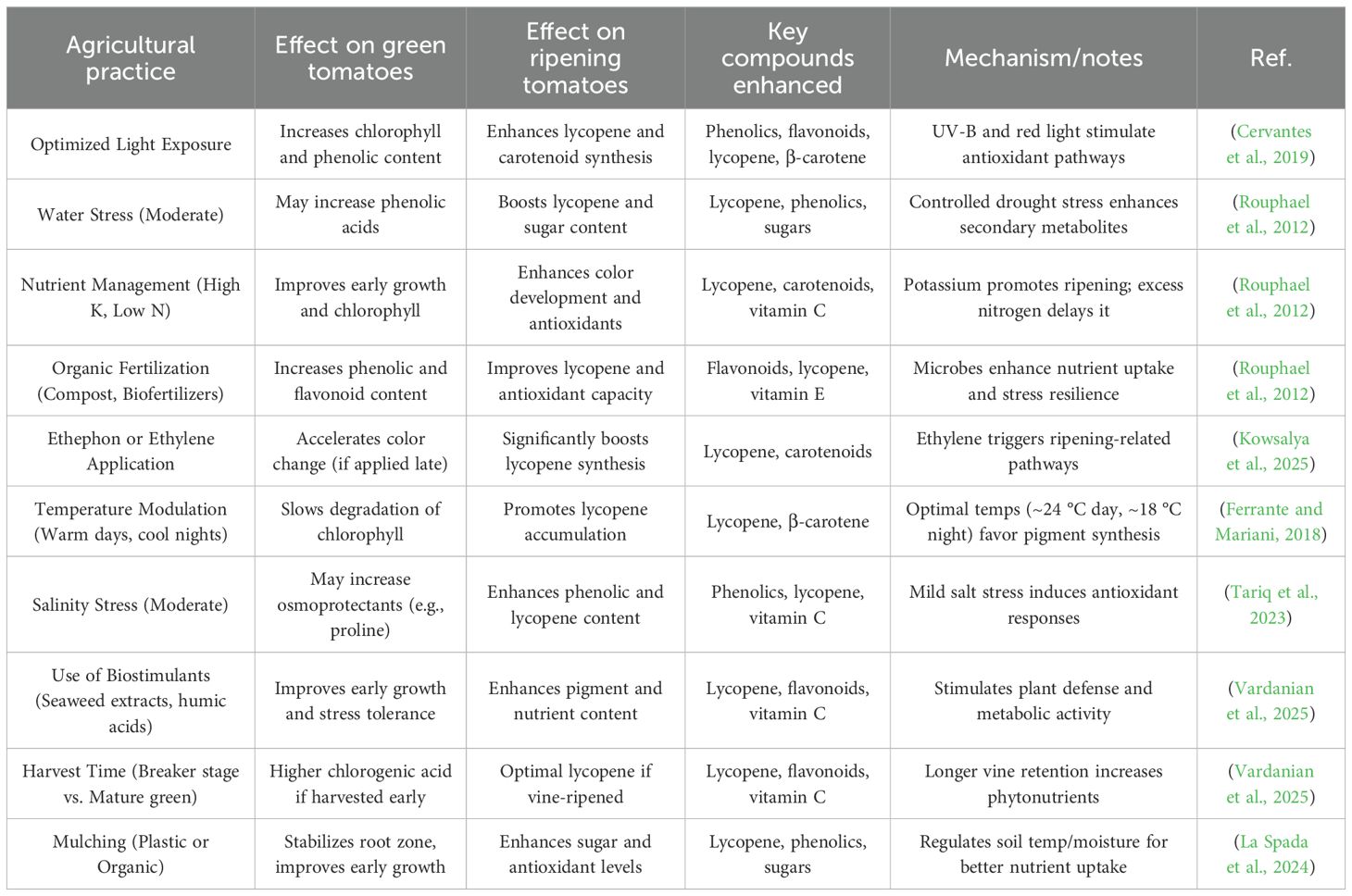 Table 2. Summarizing agricultural practices that can enhance the biosynthesis and accumulation of valuable compounds in green and ripening tomatoes (Solanum lycopersicum).
