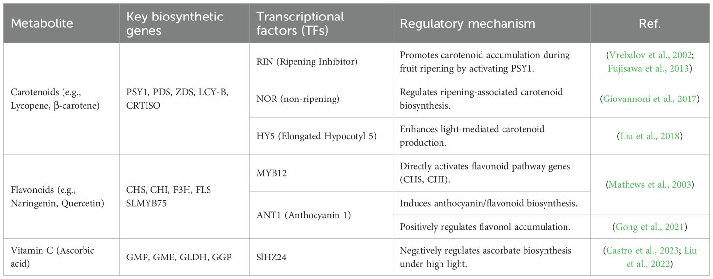 Biosynthesis gene regulatory networks closely control the manufacture and accumulation of these metabolites, and transcription factors (TFs) are essential for modifying their expression, as Table 3 illustrates. Key TFs, including R2R3-MYB, bHLH, WRKY, and AP2/ERF families, orchestrate the transcriptional activation or repression of structural genes involved in carotenoid (e.g., PSY, LCY, CYCB) and flavonoid pathways (e.g., CHS, F3H, FLS). Similarly, vitamin C (ascorbate) levels are influenced by TFs regulating genes in the L-galactose pathway (GGP, GalDH) and recycling enzymes (MDHAR, DHAR) (Liang and Li, 2023; Wu et al., 2022; Stanley and Yuan, 2019). Environmental stimuli, hormonal signals (such as ethylene and abscisic acid), and light-responsive TFs (e.g., HY5) further fine-tune these pathways, creating a dynamic interplay between genetic and external factors (Mo et al., 2021). Advances in omics technologies and CRISPR-based genome editing have unveiled novel TF-target interactions, providing opportunities for metabolic engineering to enhance tomato’s nutritional profile. This review synthesizes current knowledge on TF-mediated regulation of carotenoids, flavonoids, and vitamin C, highlighting potential strategies for biofortification and improved stress resilience in tomato cultivars.