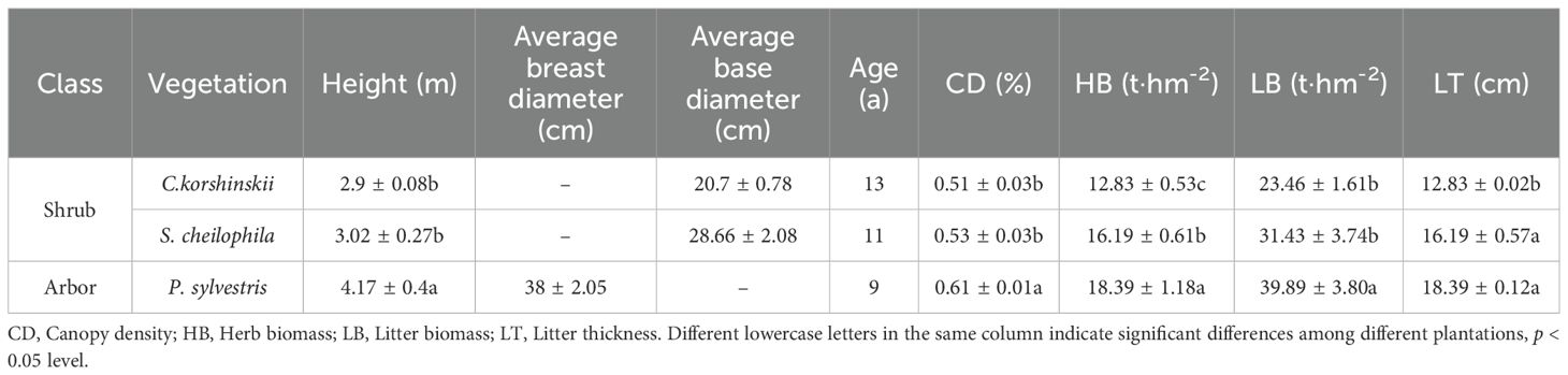 In the tree plot of 20 m × 20 m and the shrub plot of 15 m × 15 m, nine sampling points were selected. A soil sample from a depth of 0–150 cm was collected with a ring knife of 5 cm in diameter. Subsequently, soil samples from depths of 0-10, 10-20, 20-40, 40-60, 60-80, 80–100 and 100–150 cm were taken once. The collected soil was shade-dried, and its physical and chemical properties were determined. Soil samples were gathered in aluminum boxes to determine soil bulk density and soil mass water concentration (SMC, %). The method for determining SMC involved drying the sample in an oven at 105°C for 24 hours until it reached a constant weight. SOC (g·kg-1) was monitored by the dichromate titration-external heating method (Zhang et al., 2025). Soil N was determined by the Kjeldahl method (Cao et al., 2023).