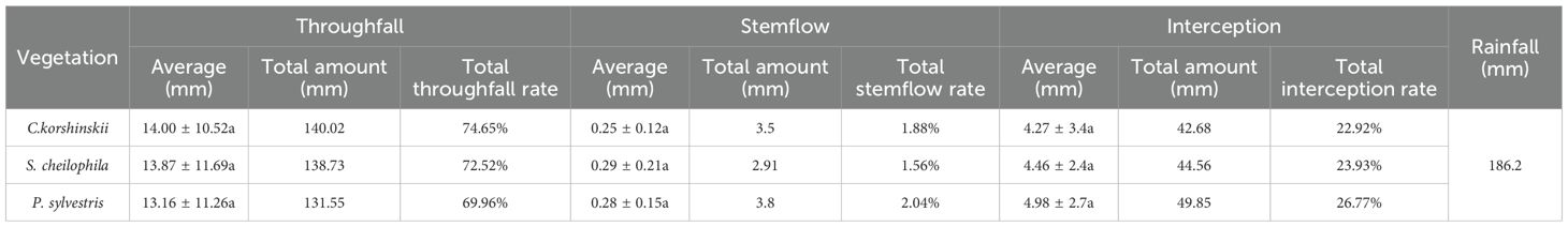 Results: The critical throughfall values for C. korshinskii (Ck), S. Cheilophila (Sc) and P. sylvestris (Ps) were 0.28, 1.78 and 2.04 mm, respectively. Corresponding stemflow critical values measured were 2.93, 1.08, and 3.30 mm, respectively. Ps exhibited the highest interception capacity, which was attributable to its dense canopy and layered branch architecture. Sc ranked second due to its larger leaf area, while Ck showed the lowest interception because of wide branch angles and smaller leaf area. Post-rainfall ground-level soil moisture and litter deposition are regulated by vegetation canopy structure in a direct way. SOC and N concentrations are subsequently controlled by these ground-level parameters. SOC concentration under Ps was 1.54 compared to that under Gl, while N concentration was 1.50 times higher, respectively.