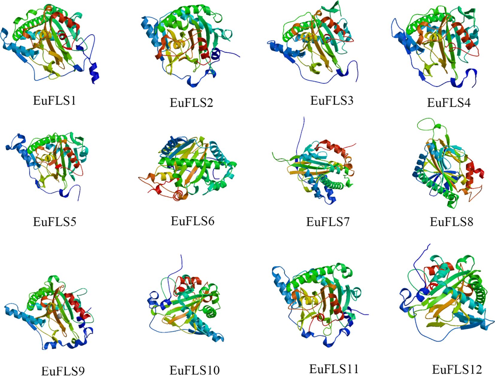 The aliphatic indices of EuFLSs ranged from 87.40 (EuFLS5) to 131.81 (EuFLS7), while the grand average of hydropathicity (GRAVY) values varied between −0.412 (EuFLS2) and 0.263 (EuFLS7). Among the 12 EuFLSs, six proteins exhibited GRAVY values of <0, indicating that they were hydrophilic in nature, while the remaining proteins were classified as lipophilic. A secondary structure analysis demonstrated that all proteins contained α-helices, extended chains, and random coils; however, no β-turns were detected (Supplementary Table S2). Specifically, the proportions of α-helices and random coils ranged from 32.12% to 41.71% and 49.86% and 59.59%, corresponding to aa counts ranging from 62 to 320 aa and 104 to 406 aa, respectively. Overall, the secondary structure composition of the 12 EuFLSs was in the following order based on abundance: random coils > α-helices > extended chains > β-turns. Furthermore, to obtain more structural insights, the 3D structures of EuFLS proteins were also modeled. All these 3D structures had an almost similar structural composition with secondary structures (Figure 1).