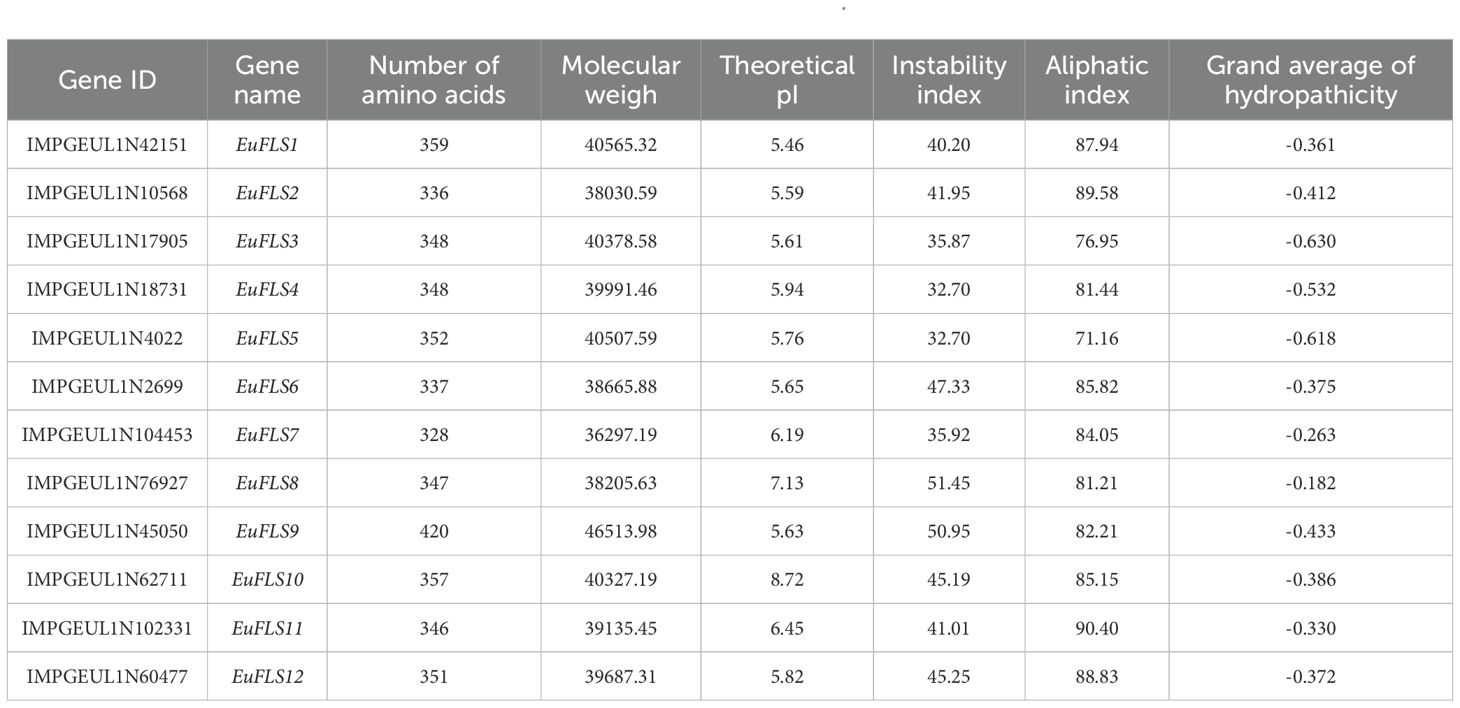 Using the AtFLS sequence as a reference and performing comparative analyses with the NCBI and Pfam databases, a total of 12 EuFLSs were identified in the E. ulmoides genome, designated as EuFLS1 to EuFLS12. The physicochemical properties of the EuFLSs were analyzed using the ExPASy tool. The results showed that the polypeptides encoded by the 12 EuFLSs comprised 328–420 amino acids (aa) (Table 1), with the longest being EuFLS9 (420 aa) and the shortest being EuFLS7 (328 aa). The molecular weight (MW) of the proteins varied from 36297.19 Da (EuFLS7) to 46513.98 Da (EuFLS9), and the isoelectric point (pI) ranged from 5.46 (EuFLS1) to 8.72 (EuFLS10). Notably, only EuFLS8 and EuFLS10 exhibited pI values >7, classifying them as basic proteins. The remaining EuFLSs had pI values <7, indicating that they were acidic in nature. Regarding protein stability, the instability indices of the EuFLSs ranged from 32.70 (EuFLS4 and EuFLS5) to 51.45 (EuFLS8). The instability indices of EuFLS3, EuFLS4, EuFLS5, and EuFLS7 below 40, categorizing them as stable proteins. The remaining EuFLSs were classified as unstable.
