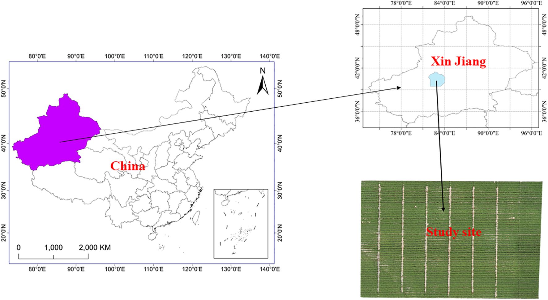 Figure 1. Experimental area and field layout. Located in Hailou Town, Shaya County, Aksu Region, Xinjiang, China. (N 41°17’, E 82°42’, 897 m above sea level).