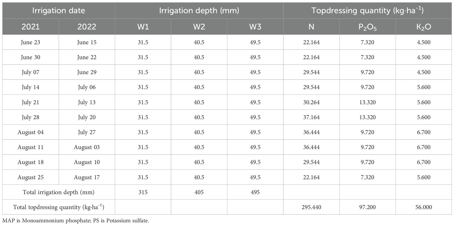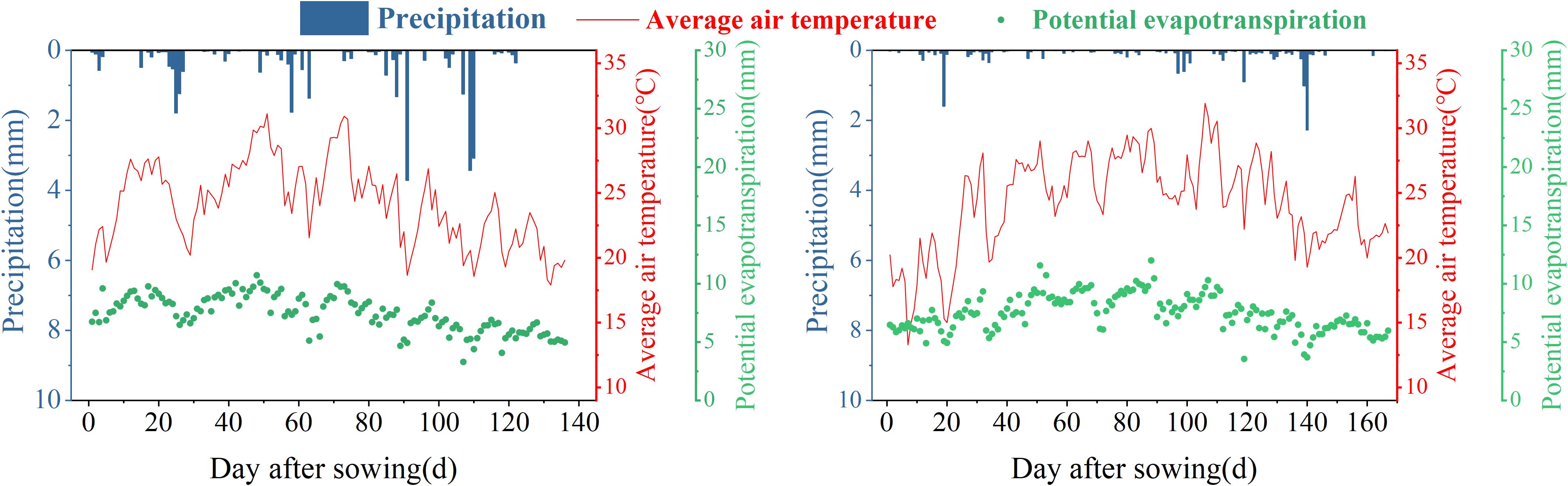 h: soil layer depth (cm); ρ: soil bulk density (g·cm-3); θ: soil gravimetric moisture content (%); P: precipitation (mm); I: irrigation (mm); ΔW: changes in soil water storage between the beginning and end of the cotton growing season (mm). K is the groundwater recharge amount during the period (mm), which can be neglected when the groundwater table depth is greater than 2.5 m (in this experiment, the groundwater table depth was below 5 m, resulting in no groundwater recharge). D is the deep percolation amount (mm); R is the surface runoff amount (mm). Drip irrigation under mulch was used during irrigation events. This method delivers water directly and slowly to the root zone of the cotton plants via drip tapes. The application rate is low and the water is supplied gradually, allowing sufficient time for soil absorption. Consequently, surface ponding or runoff is virtually non-existent, and water is unlikely to percolate below the root zone into deeper soil layers. Therefore, both D and R are considered negligible and are disregarded.