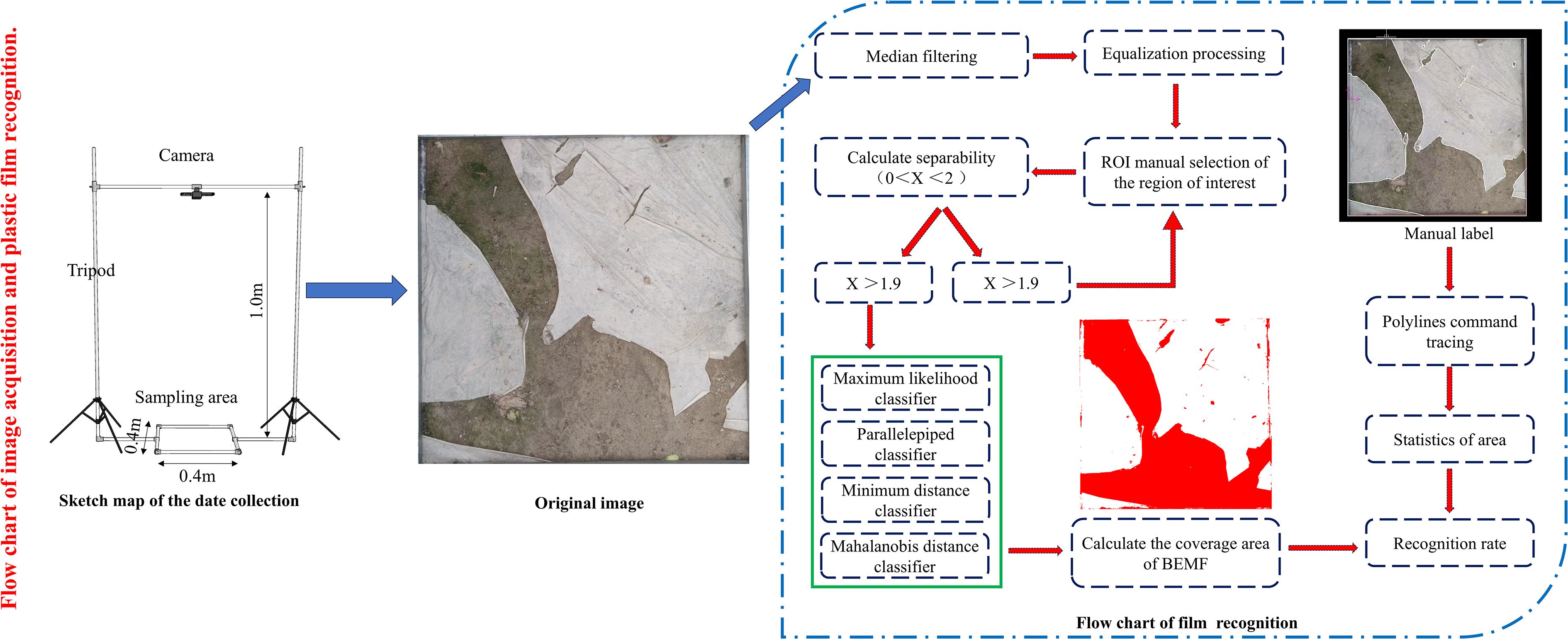 where S1 represents the biodegradable film residual area in the sampling zone; S2 denotes the sampling region area; Sa indicates the total area covered by the biodegradable film prior to degradation; and Sb refers to the total area of the field.