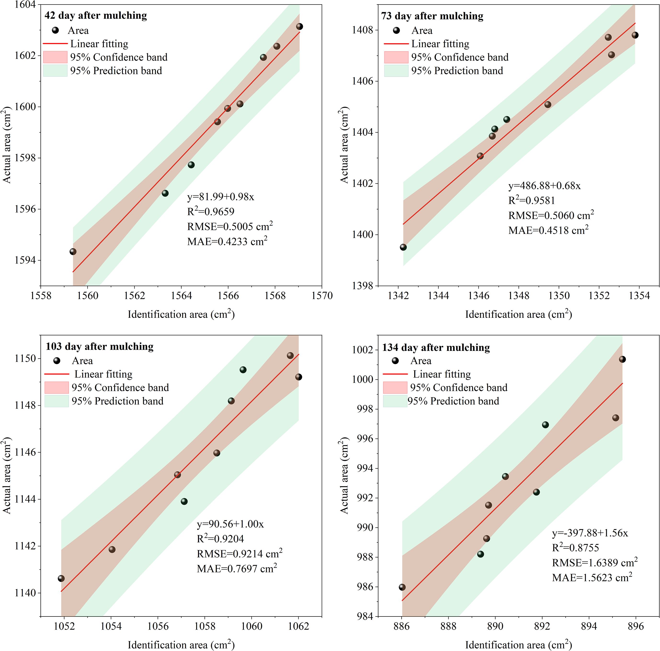 A method for monitoring the biodegradable film area based on supervised classifiers was employed for film identification, as illustrated in Figure 3. The main steps were as follows. (1) Image processing: The images were normalized and subjected to 3 × 3 median filtering to eliminate anomalies and histogram equalization to enhance the contrast of the objects in the images. (2) Film identification: The primary features within the sampling area included the film, soil, and drip irrigation tape. Regions of interest (ROIs) were delineated utilizing ENVI 5.3 software, and the areas covered by the film were manually selected to extract the reflectance information of the ROI. The reflectance characteristics of the extracted film-covered areas were analyzed using four classifiers based on traditional statistical analysis from the supervised classification module in ENVI (parallelepiped, minimum distance, Mahalanobis distance, and maximum likelihood classifiers), with the maximum likelihood and minimum distance classifiers demonstrating the best classification performance. The reflectance pixel points of the film-covered regions in the images were separated, with different colors used to distinguish between the ROIs and regions that were not of interest, thereby determining the film identification area in the sampling zone. (3) Accuracy verification: The images were imported into AutoCAD 2020 (Autodesk, Inc.) and scaled to dimensions of 0.4 × 0.4 m. The polyline command was then used to outline the damaged areas, forming closed-loop regions complemented by an area statistical command to individually identify the damaged areas in the study zone. The proportion of actual film damage was calculated by dividing the damaged area by the observed area (Chen et al., 2021b). Biodegradable film degradation was determined at different stages, with statistics on the identified area of film, actual area, and identification rate recorded, as shown in Figure 4. The results showed that with prolonged coverage duration, the identification rate of the film gradually diminished due to the film’s color shifting to yellow over time, blending with the soil’s grayscale, and reducing the identification rate.