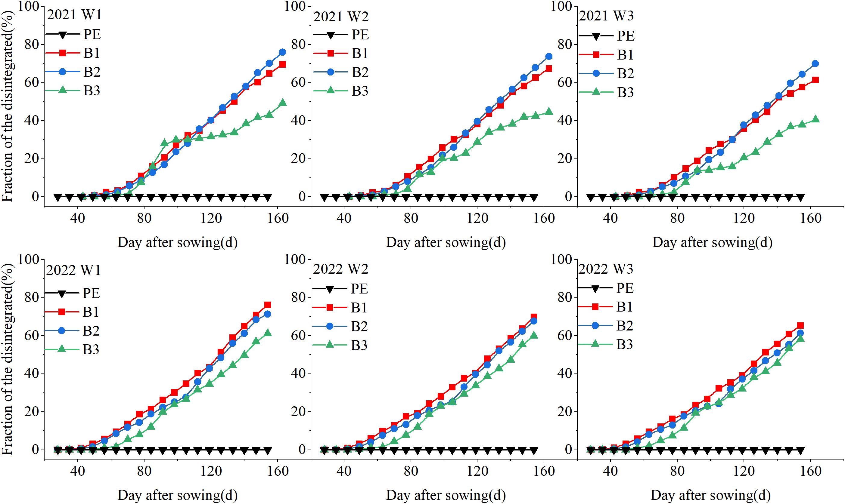 Figure 6. Proportion of membrane degradation area of mulch films under differing irrigation depths (2021–2022). W1: 315 mm (63.6% ET0); W2: 405 mm (81.8% ET0); and W3: 495 mm (100% ET0). PE: polyethylene mulch film; B1: Fully biodegradable mulch; B2: Thermo-oxygen-biodegradable mulch; B3: Fully biodegradable mulch.